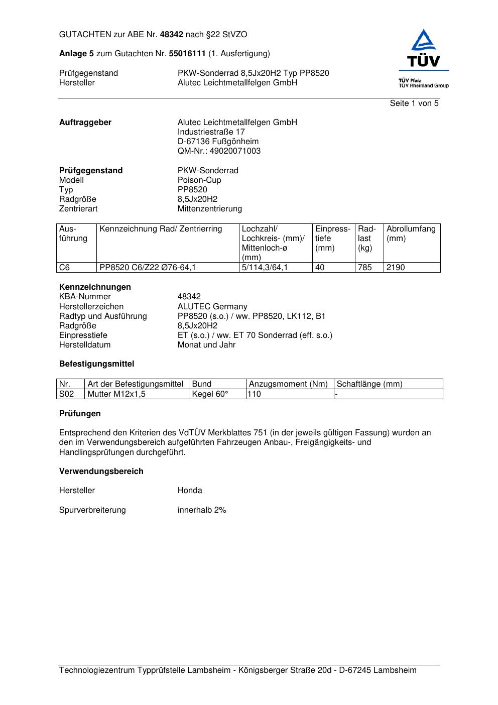 Dieses Gutachten (abe) bezieht sich auf die Alufelge ALUTEC PP8520 in der Ausführung 8.5Jx2 ET 0, Mittenloch 0 mm (KBA 48342). Im PDF findest du typischerweise zulässige Reifengrößen, Auflagen/Anbauhinweise und – je nach Dokument – Hinweise zur Eintragung.