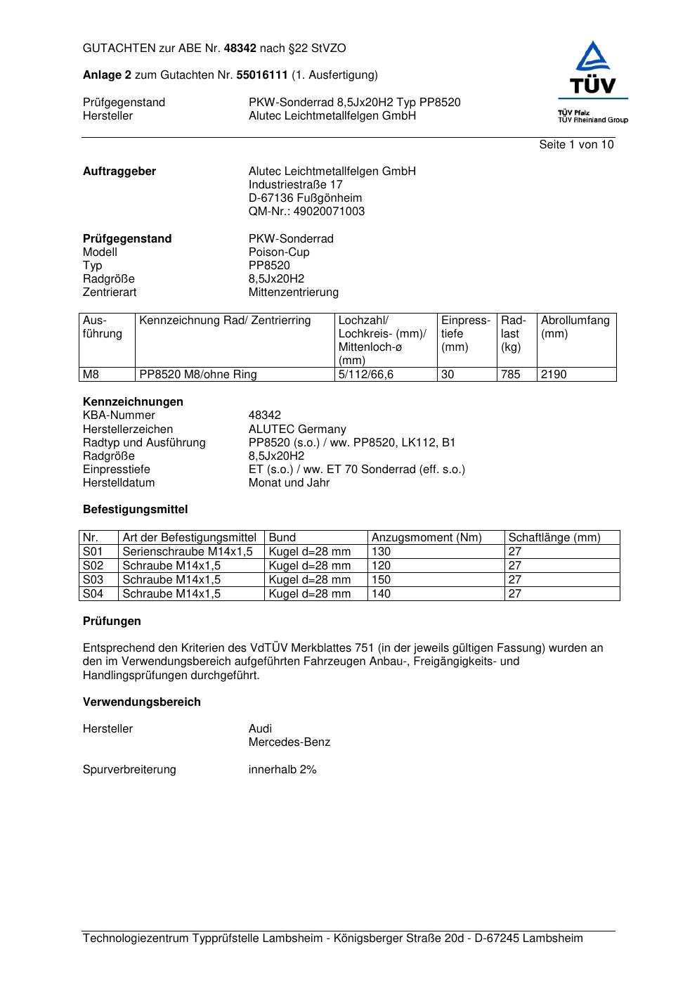 Dieses Gutachten (abe) bezieht sich auf die Alufelge ALUTEC PP8520 in der Ausführung 8.5Jx2 ET 0, Mittenloch 0 mm (KBA 48342). Im PDF findest du typischerweise zulässige Reifengrößen, Auflagen/Anbauhinweise und – je nach Dokument – Hinweise zur Eintragung.
