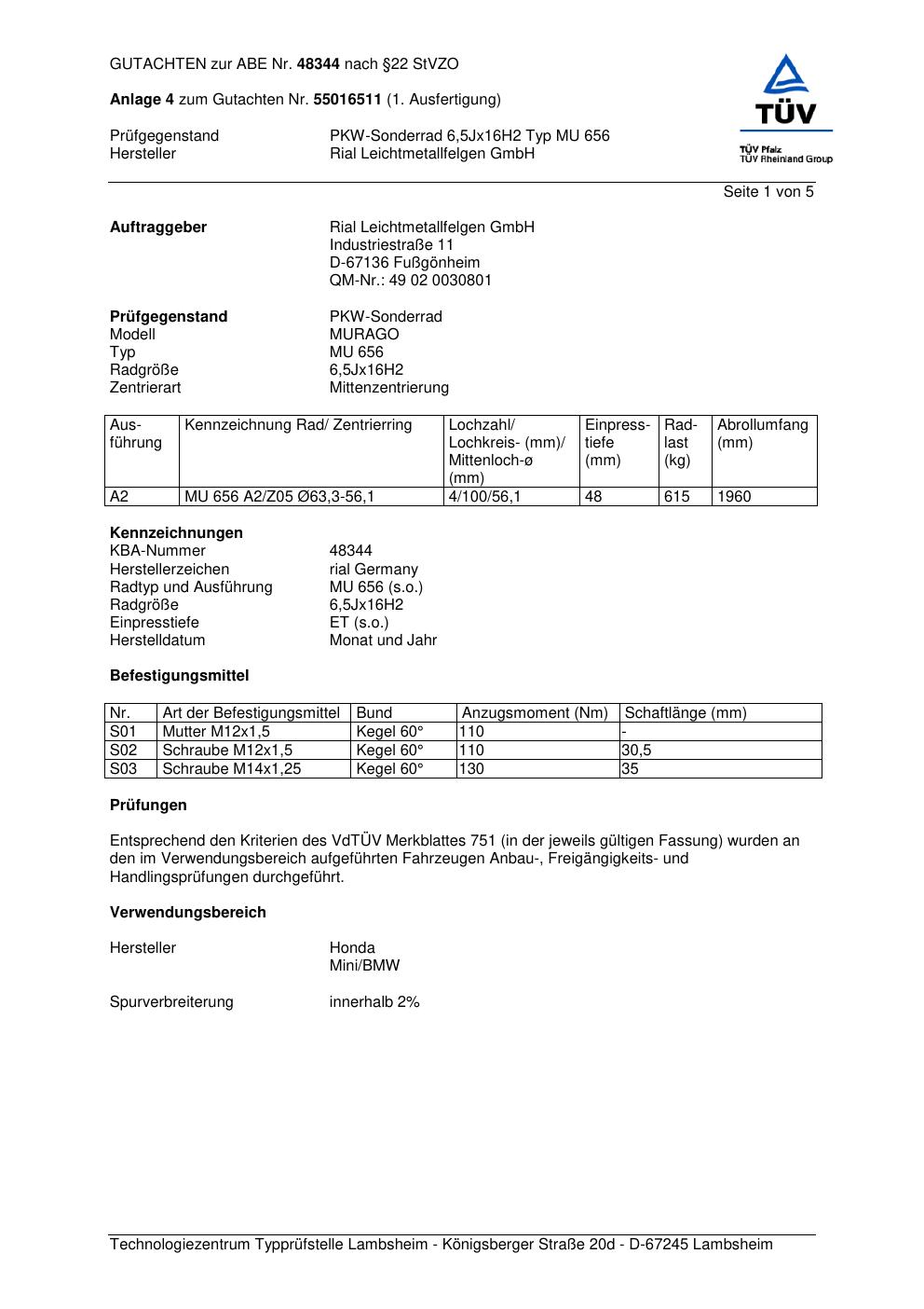 Dieses Gutachten (abe) bezieht sich auf die Alufelge brand-rial MU 656 in der Ausführung 6.5Jx16 ET 0, Mittenloch 0 mm (KBA 48344). Im PDF findest du typischerweise zulässige Reifengrößen, Auflagen/Anbauhinweise und – je nach Dokument – Hinweise zur Eintragung.