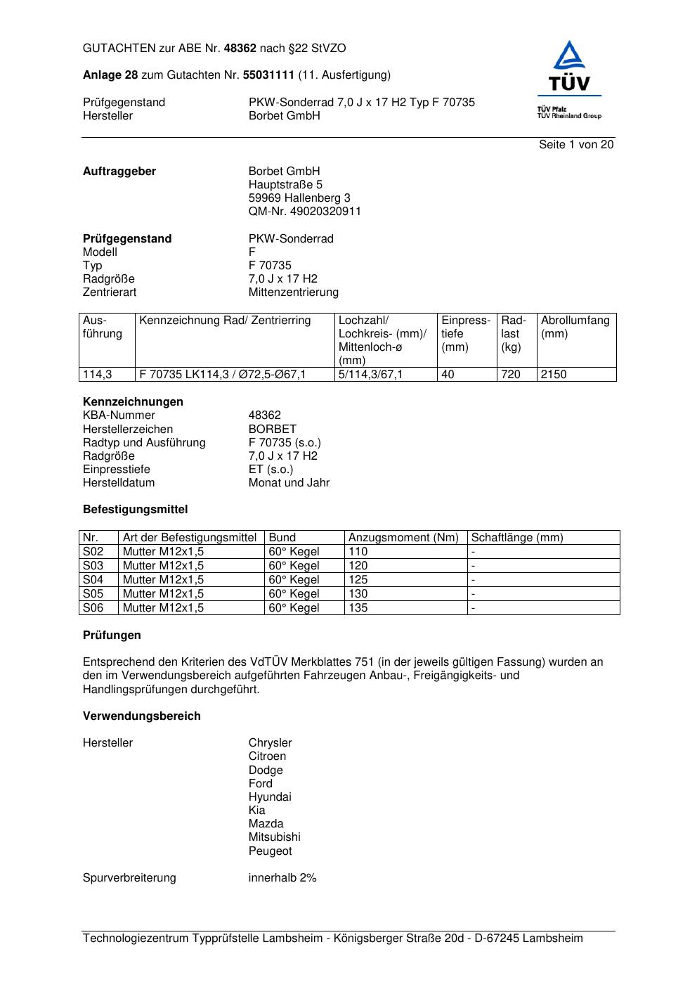Dieses Gutachten (abe) bezieht sich auf die Alufelge Borbet F 70 735 in der Ausführung 7Jx17 ET 0, Mittenloch 0 mm (KBA 48362). Im PDF findest du typischerweise zulässige Reifengrößen, Auflagen/Anbauhinweise und – je nach Dokument – Hinweise zur Eintragung.