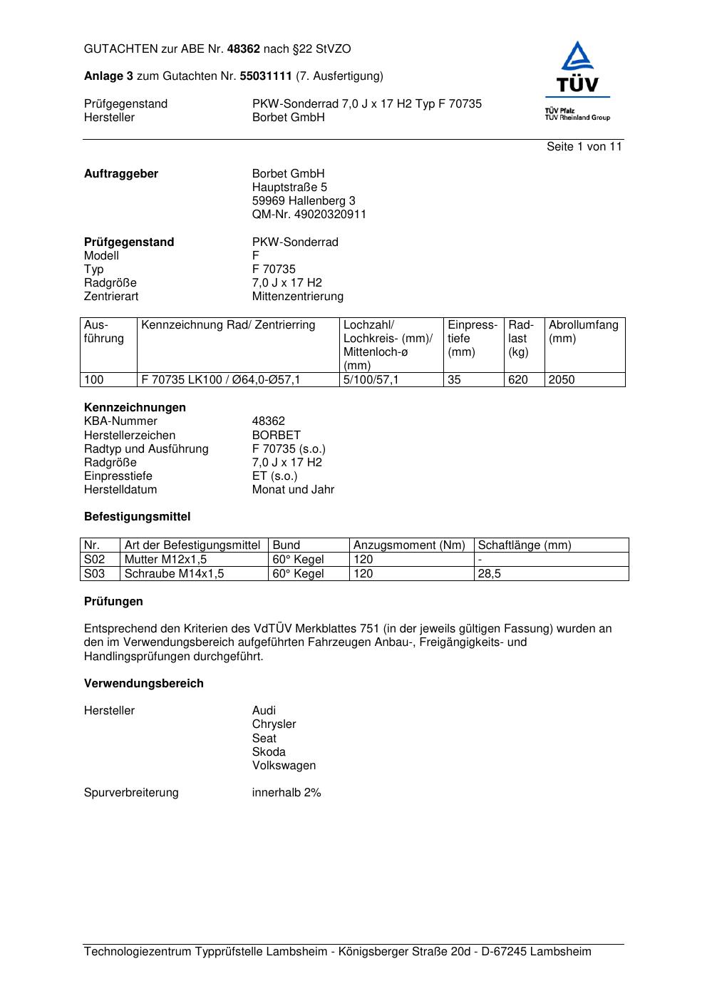 Dieses Gutachten (abe) bezieht sich auf die Alufelge Borbet F 70 735 in der Ausführung 7Jx17 ET 0, Mittenloch 0 mm (KBA 48362). Im PDF findest du typischerweise zulässige Reifengrößen, Auflagen/Anbauhinweise und – je nach Dokument – Hinweise zur Eintragung.