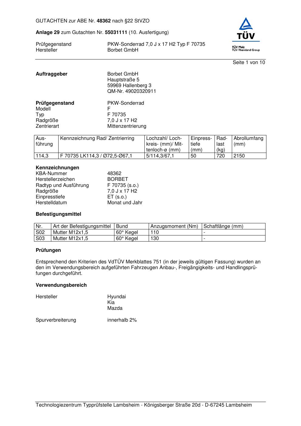 Felgengutachten / abe für Alufelgen Borbet F 70 735 (7Jx17 ET 0, Mittenloch 0 mm) mit KBA 48362 (Zertifikatsnummer 48362). Hier kostenlos als PDF herunterladen. Der Download-Link ist 24 Stunden gültig und kann bis zu zwei Mal verwendet werden.