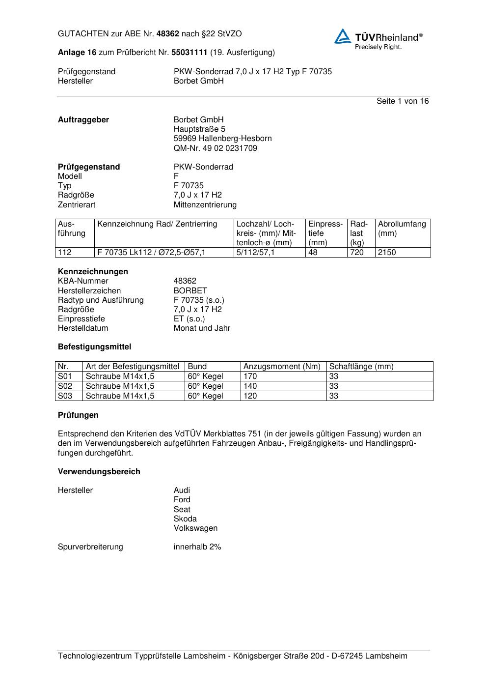 Felgengutachten / abe für Alufelgen Borbet F 70 735 (7Jx17 ET 0, Mittenloch 0 mm) mit KBA 48362 (Zertifikatsnummer 48362). Hier kostenlos als PDF herunterladen. Der Download-Link ist 24 Stunden gültig und kann bis zu zwei Mal verwendet werden.