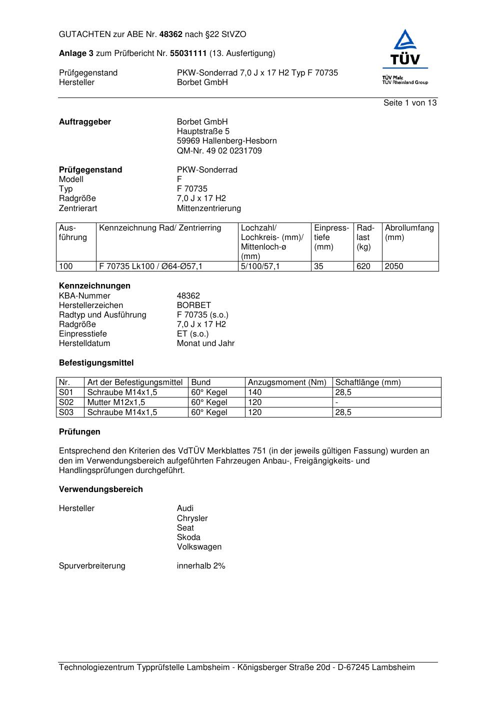 Dieses Gutachten (abe) bezieht sich auf die Alufelge Borbet F 70 735 in der Ausführung 7Jx17 ET 0, Mittenloch 0 mm (KBA 48362). Im PDF findest du typischerweise zulässige Reifengrößen, Auflagen/Anbauhinweise und – je nach Dokument – Hinweise zur Eintragung.