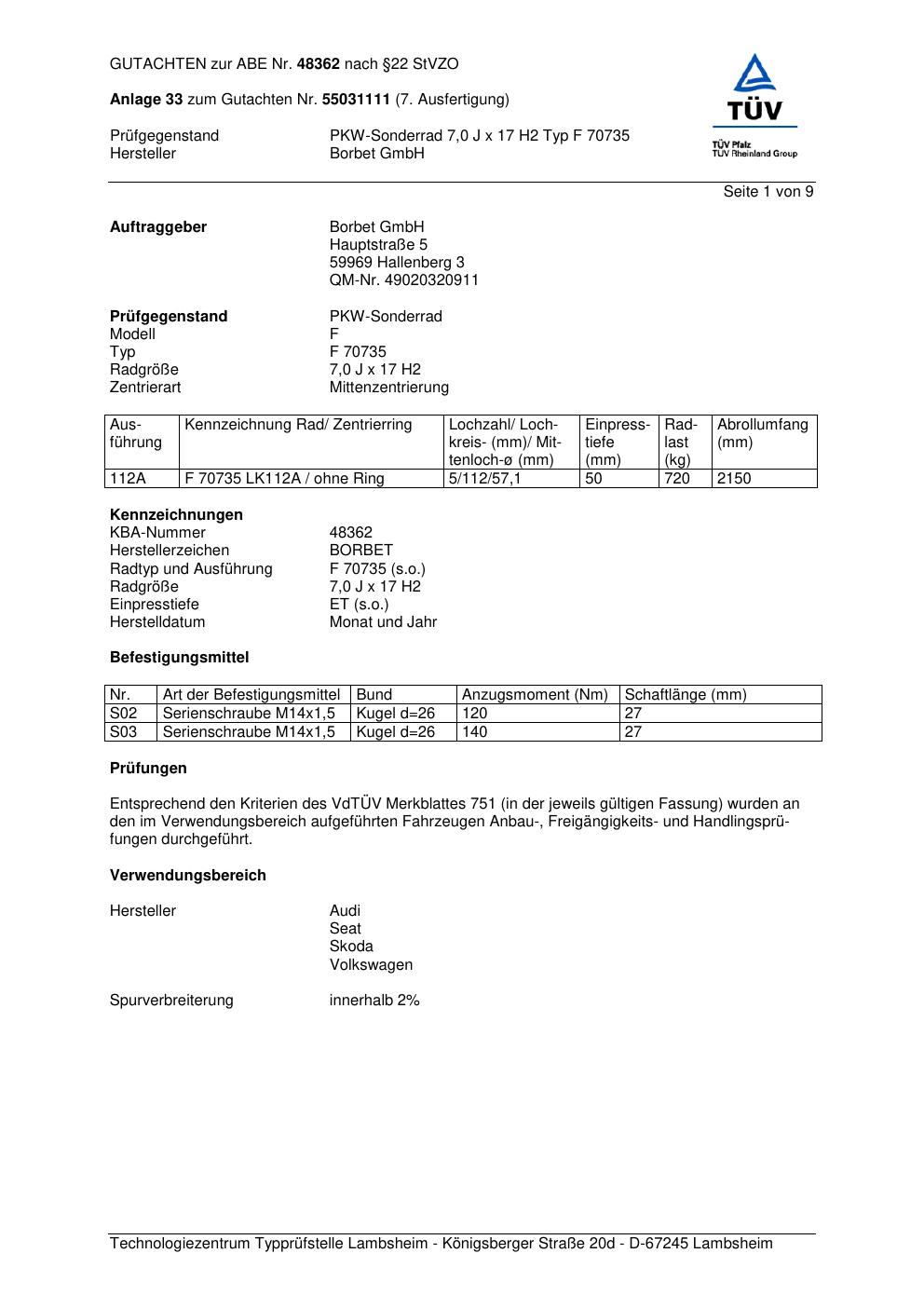 Dieses Gutachten (abe) bezieht sich auf die Alufelge Borbet F 70 735 in der Ausführung 7Jx17 ET 0, Mittenloch 0 mm (KBA 48362). Im PDF findest du typischerweise zulässige Reifengrößen, Auflagen/Anbauhinweise und – je nach Dokument – Hinweise zur Eintragung.