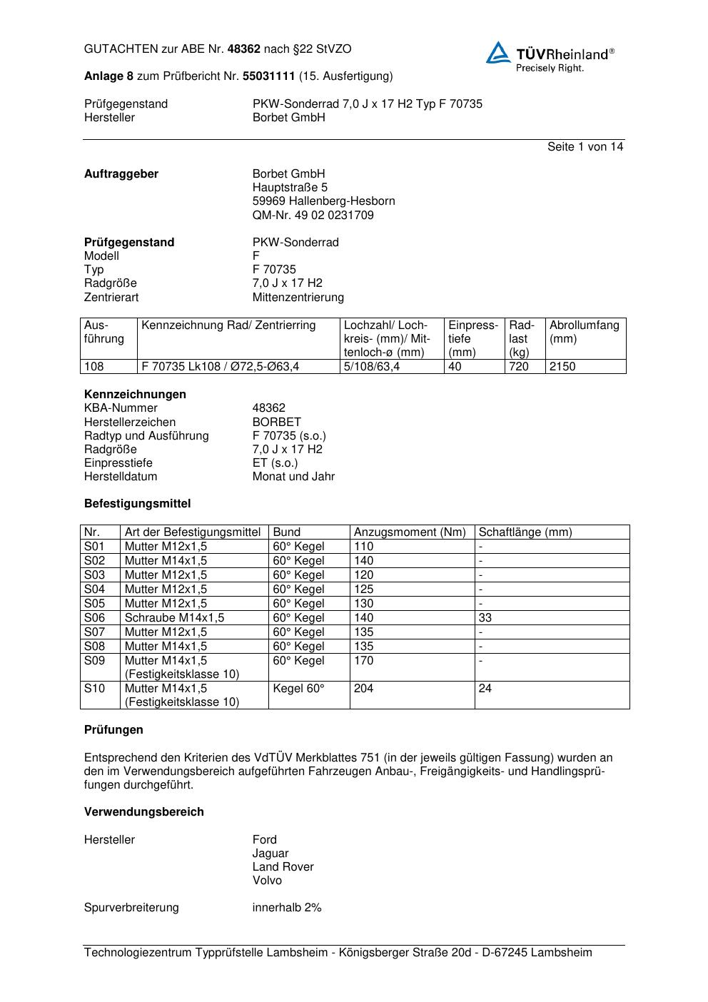 Felgengutachten / abe für Alufelgen Borbet F 70 735 (7Jx17 ET 0, Mittenloch 0 mm) mit KBA 48362 (Zertifikatsnummer 48362). Hier kostenlos als PDF herunterladen. Der Download-Link ist 24 Stunden gültig und kann bis zu zwei Mal verwendet werden.