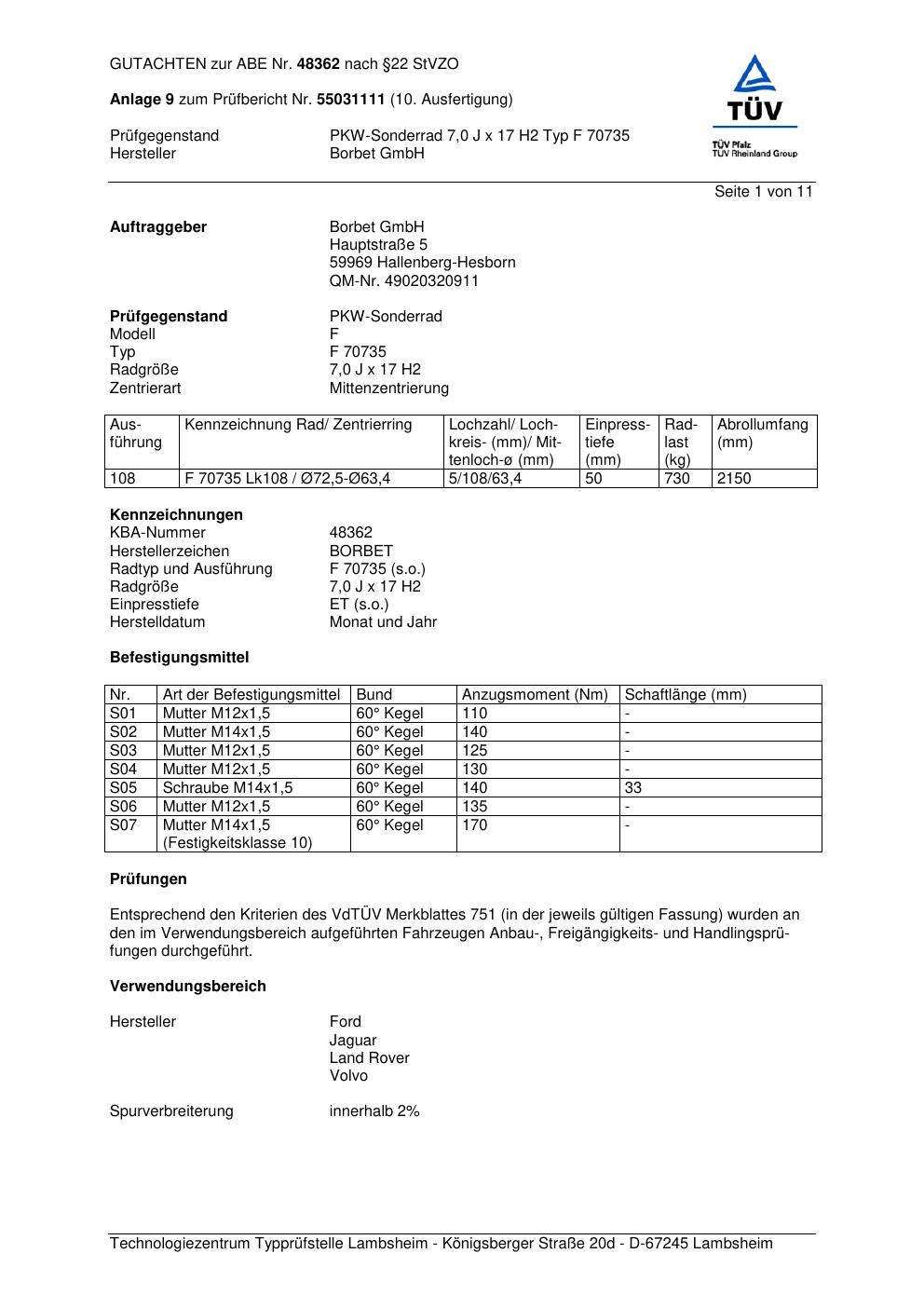 Dieses Gutachten (abe) bezieht sich auf die Alufelge Borbet F 70 735 in der Ausführung 7Jx17 ET 0, Mittenloch 0 mm (KBA 48362). Im PDF findest du typischerweise zulässige Reifengrößen, Auflagen/Anbauhinweise und – je nach Dokument – Hinweise zur Eintragung.