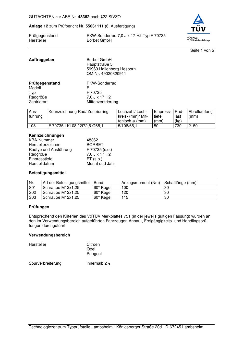 Dieses Gutachten (abe) bezieht sich auf die Alufelge Borbet F 70 735 in der Ausführung 7Jx17 ET 0, Mittenloch 0 mm (KBA 48362). Im PDF findest du typischerweise zulässige Reifengrößen, Auflagen/Anbauhinweise und – je nach Dokument – Hinweise zur Eintragung.