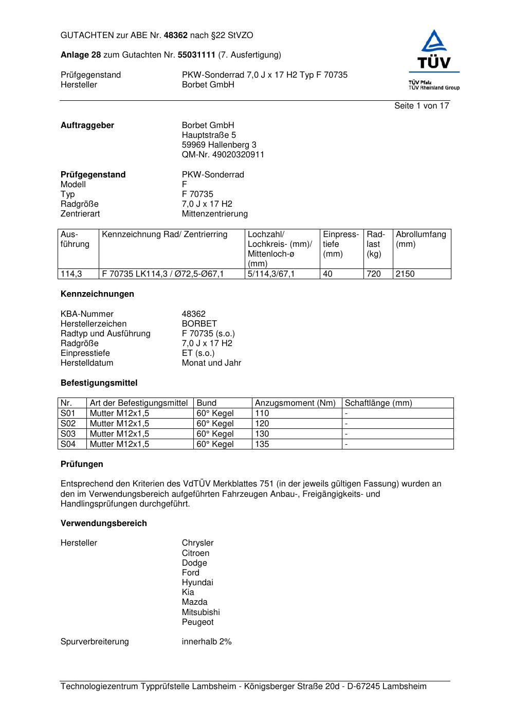 Dieses Gutachten (abe) bezieht sich auf die Alufelge Borbet F 70 735 in der Ausführung 7Jx17 ET 0, Mittenloch 0 mm (KBA 48362). Im PDF findest du typischerweise zulässige Reifengrößen, Auflagen/Anbauhinweise und – je nach Dokument – Hinweise zur Eintragung.