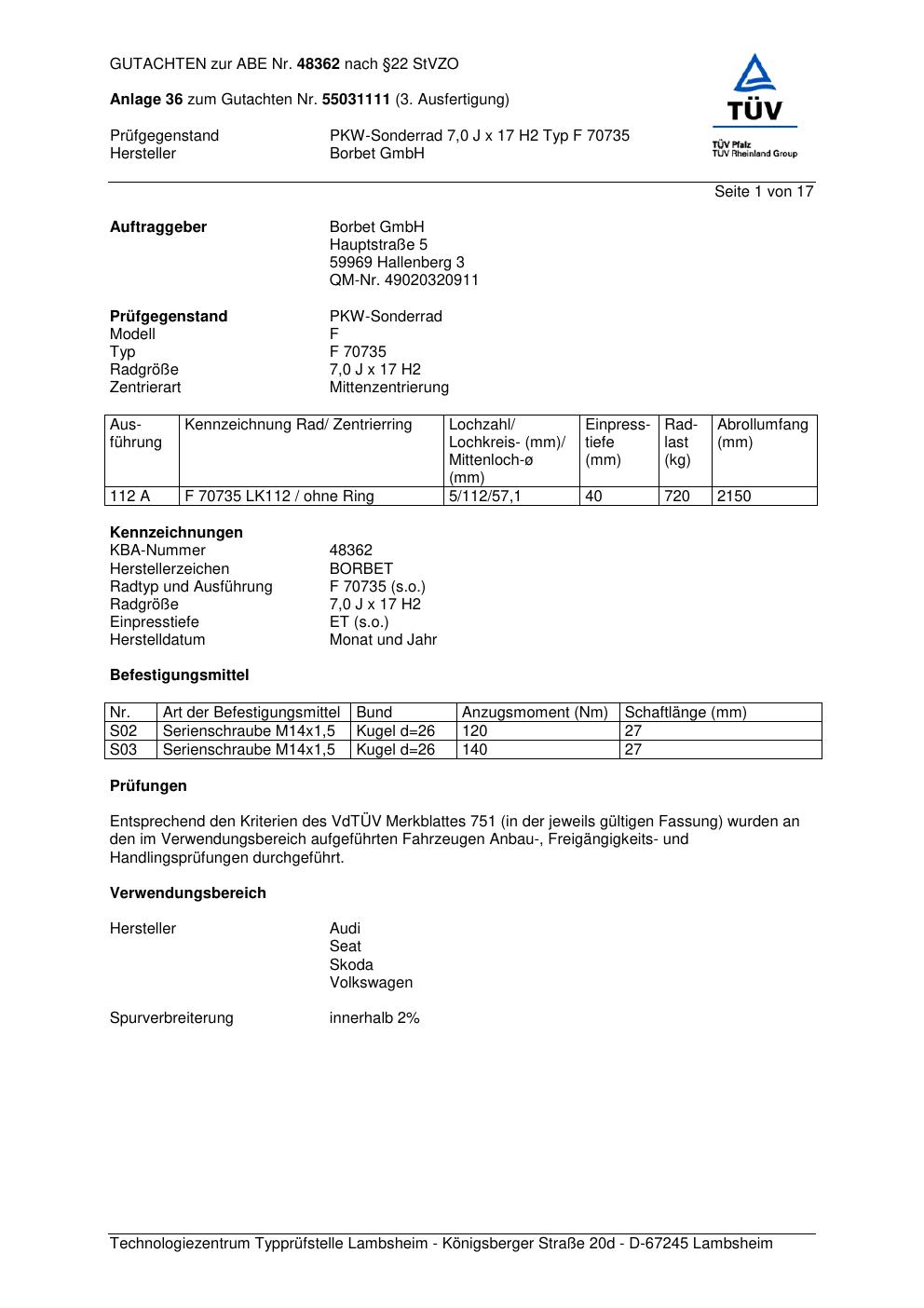 Dieses Gutachten (abe) bezieht sich auf die Alufelge Borbet F 70 735 in der Ausführung 7Jx17 ET 0, Mittenloch 0 mm (KBA 48362). Im PDF findest du typischerweise zulässige Reifengrößen, Auflagen/Anbauhinweise und – je nach Dokument – Hinweise zur Eintragung.