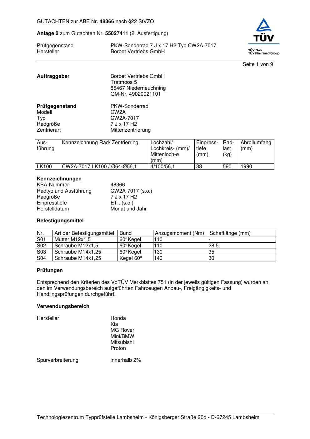 Dieses Gutachten (abe) bezieht sich auf die Alufelge Borbet CW2A-7 017 in der Ausführung 7Jx17 ET 0, Mittenloch 0 mm (KBA 48366). Im PDF findest du typischerweise zulässige Reifengrößen, Auflagen/Anbauhinweise und – je nach Dokument – Hinweise zur Eintragung.