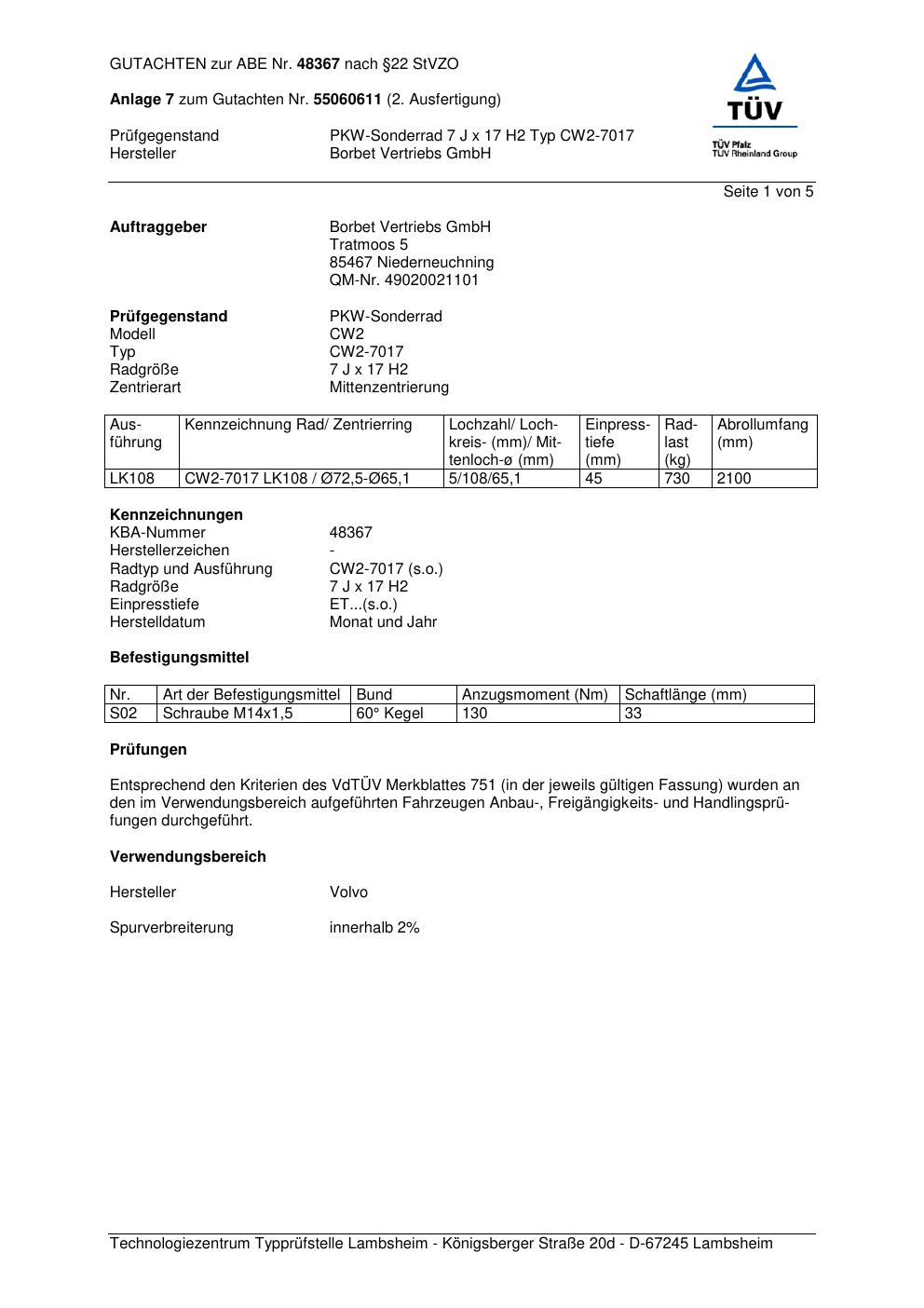 Felgengutachten / abe für Alufelgen Borbet CW2-70 17 (7Jx17 ET 0, Mittenloch 0 mm) mit KBA 48367 (Zertifikatsnummer 48367). Hier kostenlos als PDF herunterladen. Der Download-Link ist 24 Stunden gültig und kann bis zu zwei Mal verwendet werden.