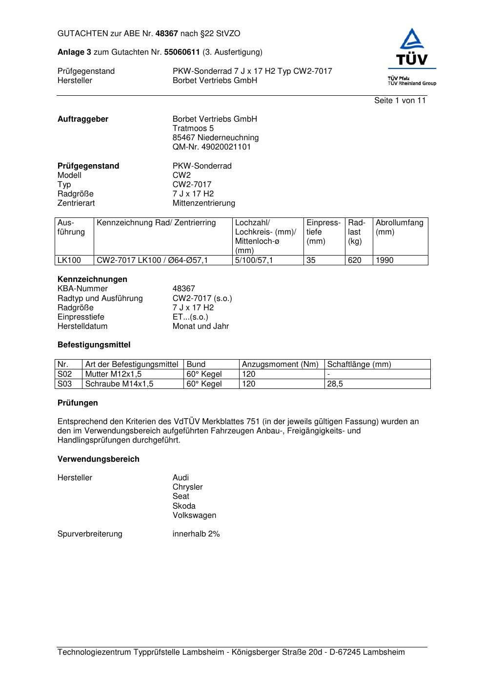Felgengutachten / abe für Alufelgen Borbet CW2-70 17 (7Jx17 ET 0, Mittenloch 0 mm) mit KBA 48367 (Zertifikatsnummer 48367). Hier kostenlos als PDF herunterladen. Der Download-Link ist 24 Stunden gültig und kann bis zu zwei Mal verwendet werden.