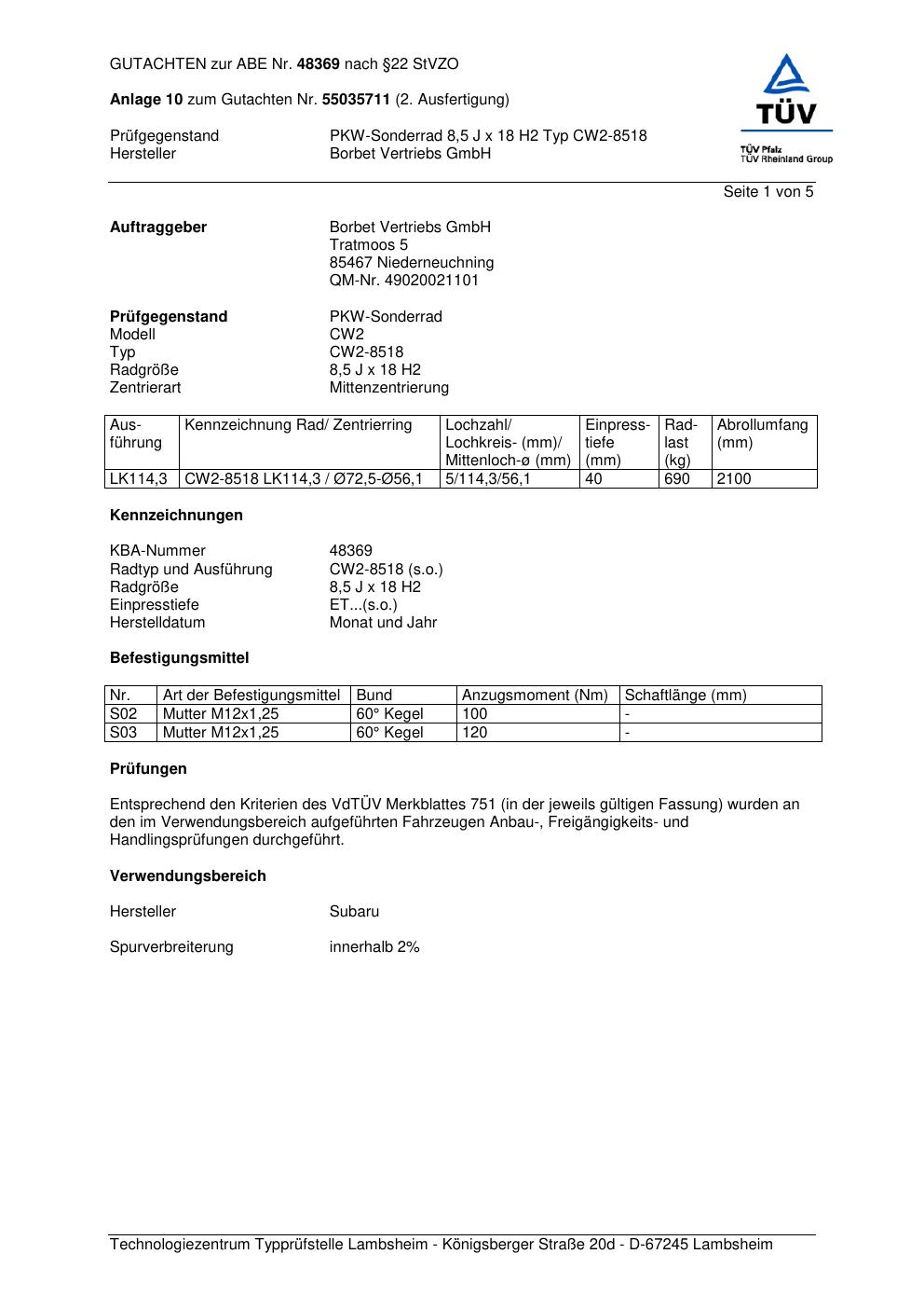 Dieses Gutachten (abe) bezieht sich auf die Alufelge Borbet CW2- 8518 in der Ausführung 8.5Jx18 ET 0, Mittenloch 0 mm (KBA 48369). Im PDF findest du typischerweise zulässige Reifengrößen, Auflagen/Anbauhinweise und – je nach Dokument – Hinweise zur Eintragung.
