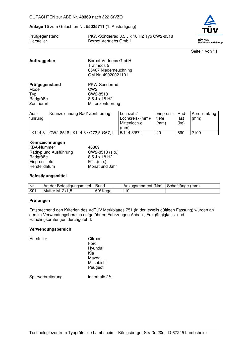 Dieses Gutachten (abe) bezieht sich auf die Alufelge Borbet CW2- 8518 in der Ausführung 8.5Jx18 ET 0, Mittenloch 0 mm (KBA 48369). Im PDF findest du typischerweise zulässige Reifengrößen, Auflagen/Anbauhinweise und – je nach Dokument – Hinweise zur Eintragung.