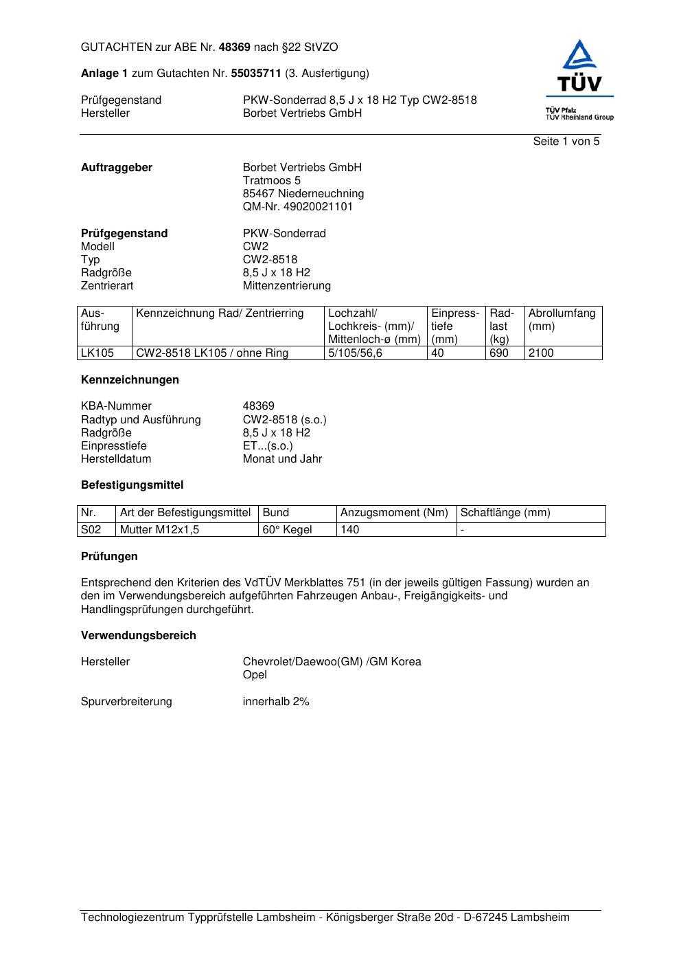 Dieses Gutachten (abe) bezieht sich auf die Alufelge Borbet CW2- 8518 in der Ausführung 8.5Jx18 ET 0, Mittenloch 0 mm (KBA 48369). Im PDF findest du typischerweise zulässige Reifengrößen, Auflagen/Anbauhinweise und – je nach Dokument – Hinweise zur Eintragung.