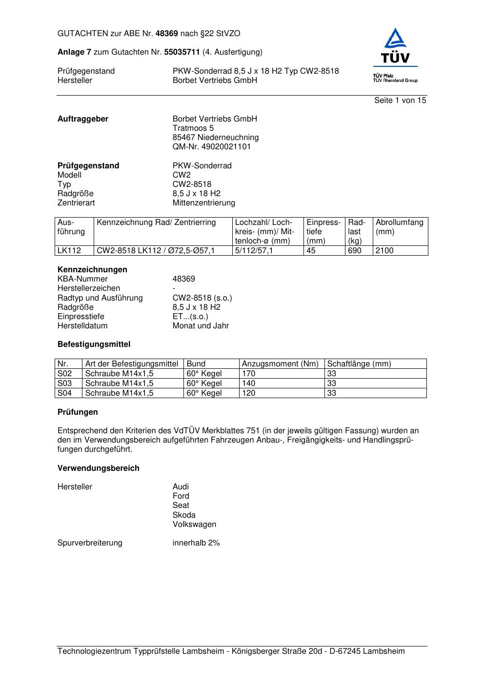 Dieses Gutachten (abe) bezieht sich auf die Alufelge Borbet CW2- 8518 in der Ausführung 8.5Jx18 ET 0, Mittenloch 0 mm (KBA 48369). Im PDF findest du typischerweise zulässige Reifengrößen, Auflagen/Anbauhinweise und – je nach Dokument – Hinweise zur Eintragung.