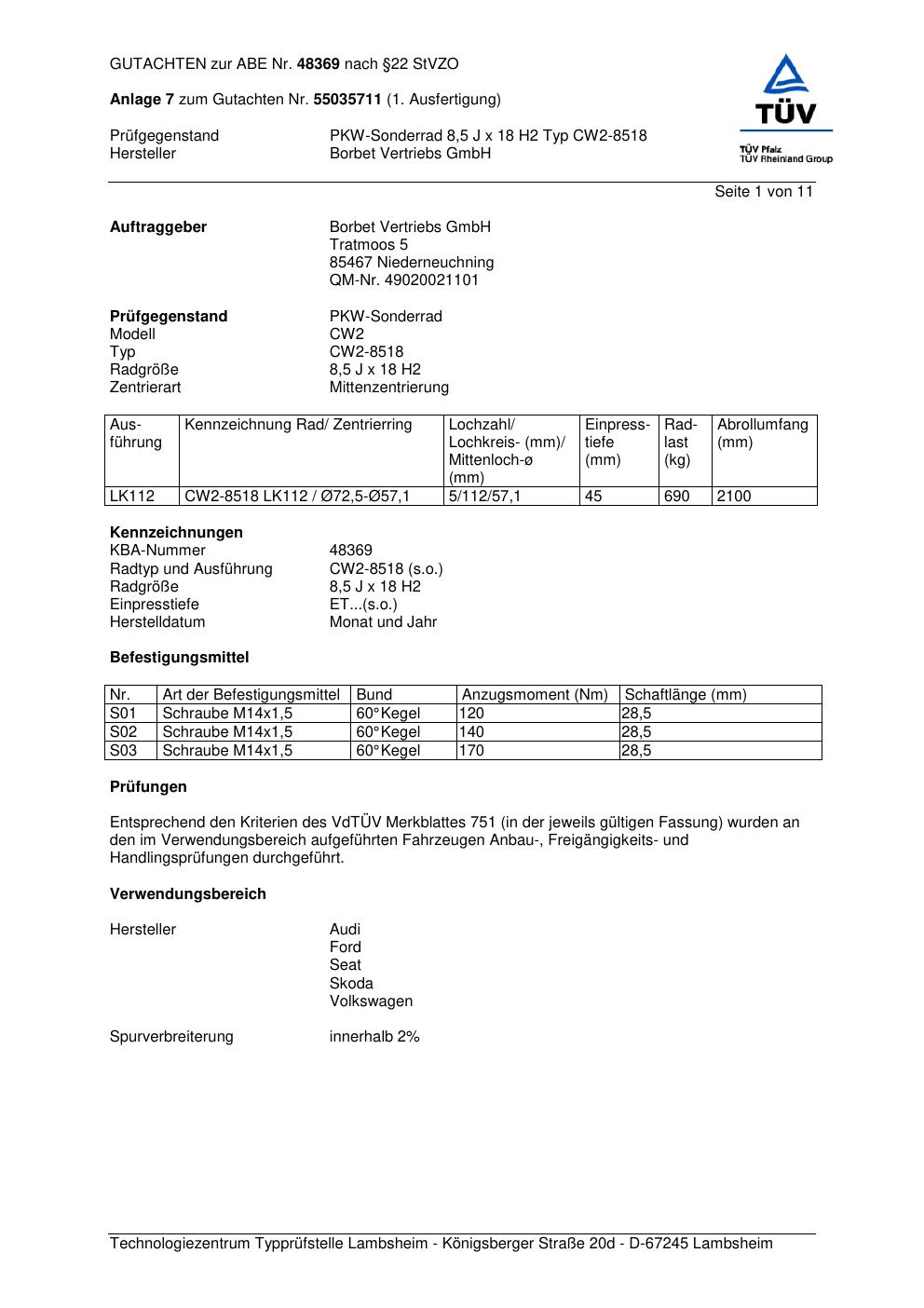 Dieses Gutachten (abe) bezieht sich auf die Alufelge Borbet CW2- 8518 in der Ausführung 8.5Jx18 ET 0, Mittenloch 0 mm (KBA 48369). Im PDF findest du typischerweise zulässige Reifengrößen, Auflagen/Anbauhinweise und – je nach Dokument – Hinweise zur Eintragung.