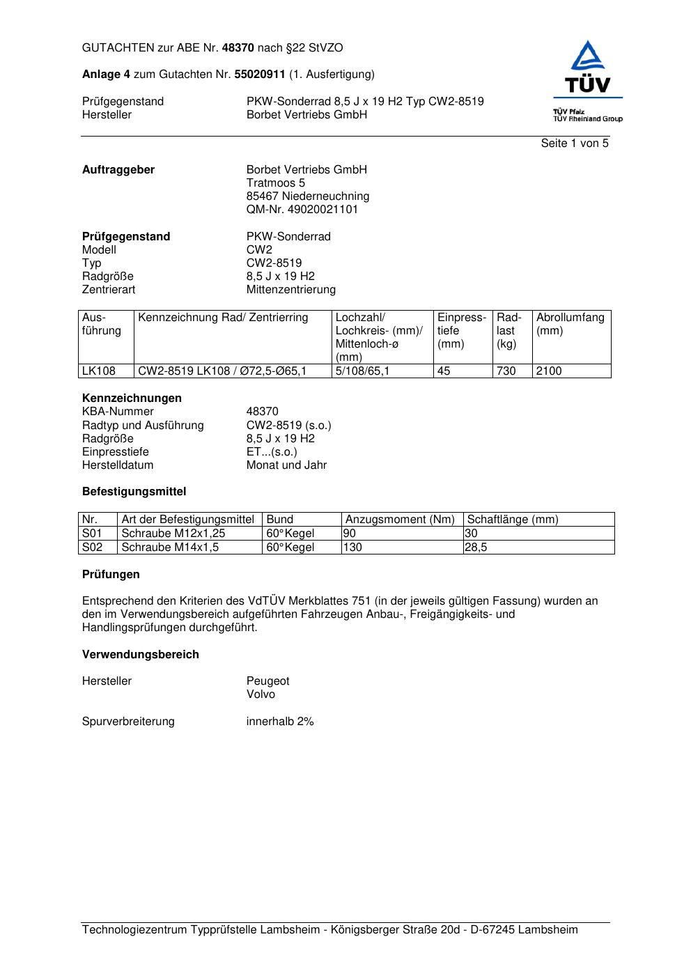 Dieses Gutachten (abe) bezieht sich auf die Alufelge Borbet CW2- 8519 in der Ausführung 8.5Jx19 ET 0, Mittenloch 0 mm (KBA 48370). Im PDF findest du typischerweise zulässige Reifengrößen, Auflagen/Anbauhinweise und – je nach Dokument – Hinweise zur Eintragung.