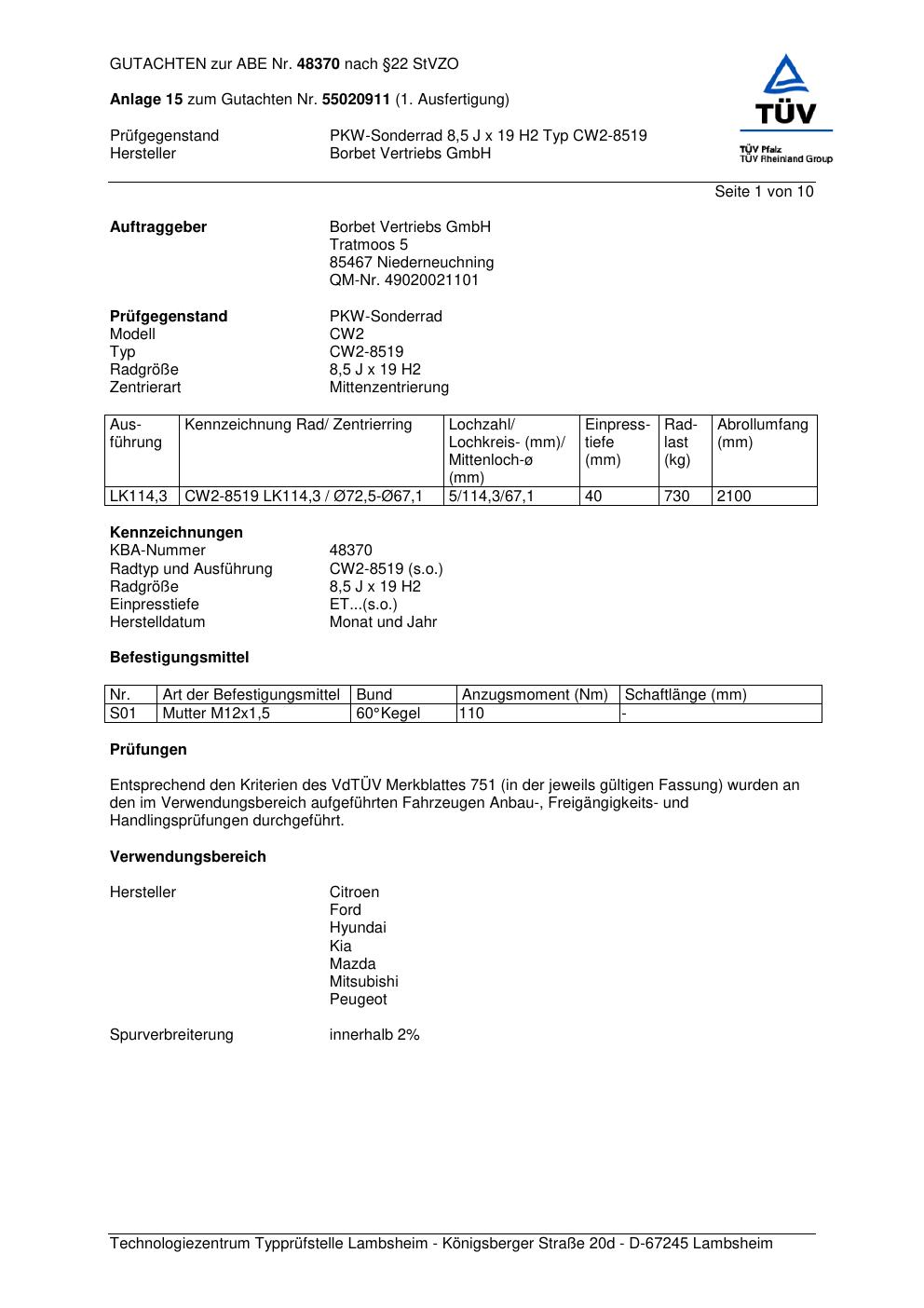 Dieses Gutachten (abe) bezieht sich auf die Alufelge Borbet CW2- 8519 in der Ausführung 8.5Jx19 ET 0, Mittenloch 0 mm (KBA 48370). Im PDF findest du typischerweise zulässige Reifengrößen, Auflagen/Anbauhinweise und – je nach Dokument – Hinweise zur Eintragung.