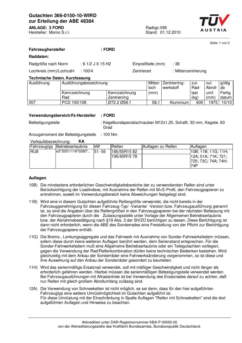 Dieses Gutachten (abe) bezieht sich auf die Alufelge brand-momo 595 in der Ausführung 2Jx15 ET 0, Mittenloch 0 mm (KBA 48384). Im PDF findest du typischerweise zulässige Reifengrößen, Auflagen/Anbauhinweise und – je nach Dokument – Hinweise zur Eintragung.