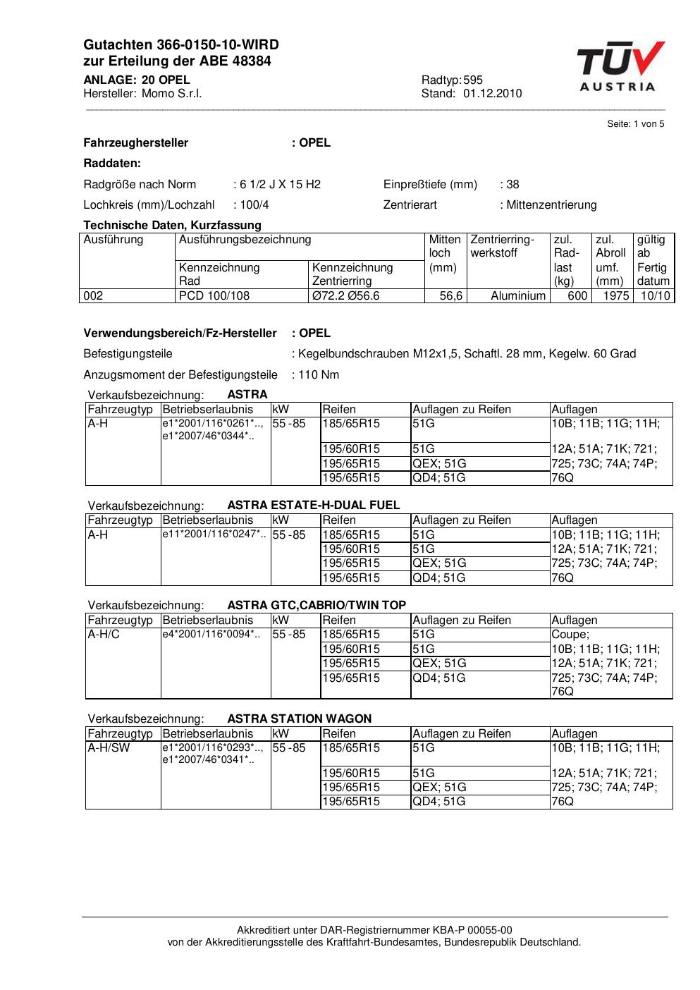 Dieses Gutachten (abe) bezieht sich auf die Alufelge brand-momo 595 in der Ausführung 2Jx15 ET 0, Mittenloch 0 mm (KBA 48384). Im PDF findest du typischerweise zulässige Reifengrößen, Auflagen/Anbauhinweise und – je nach Dokument – Hinweise zur Eintragung.