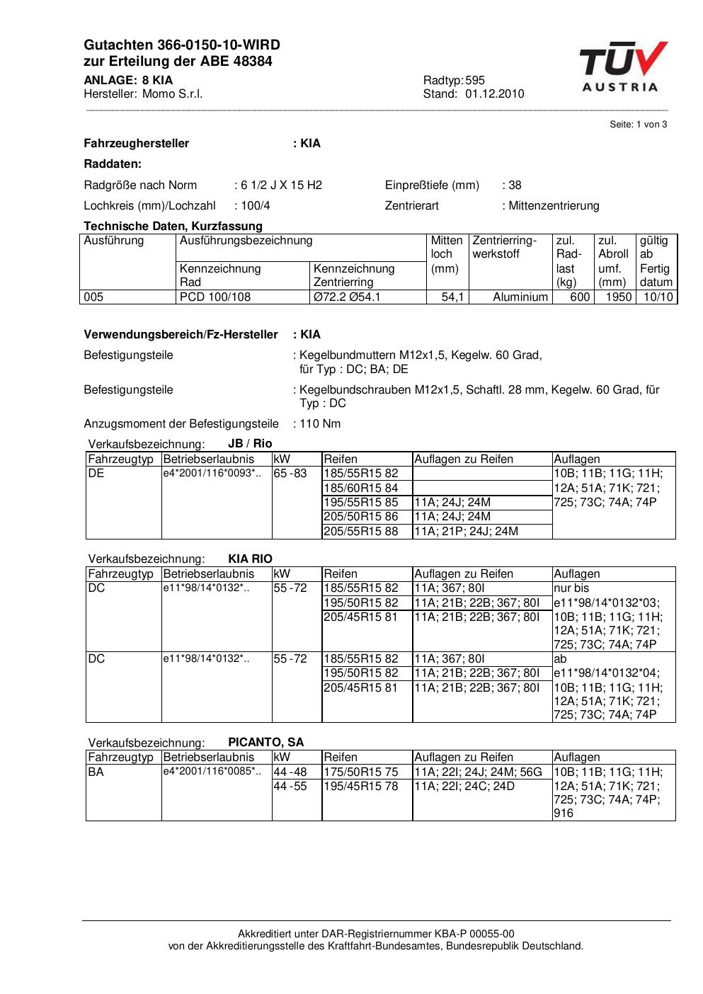 Dieses Gutachten (abe) bezieht sich auf die Alufelge brand-momo 595 in der Ausführung 2Jx15 ET 0, Mittenloch 0 mm (KBA 48384). Im PDF findest du typischerweise zulässige Reifengrößen, Auflagen/Anbauhinweise und – je nach Dokument – Hinweise zur Eintragung.