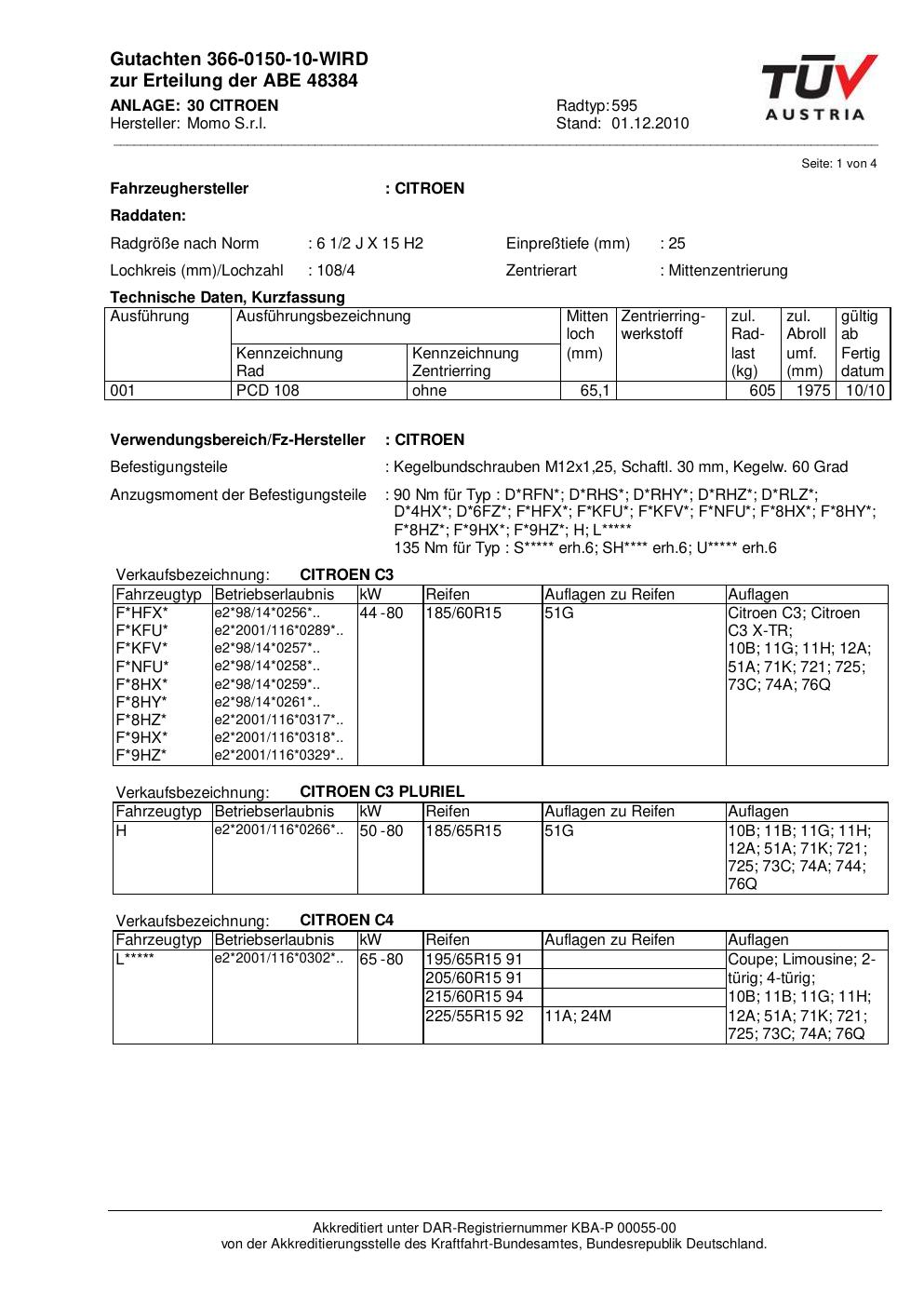 Dieses Gutachten (abe) bezieht sich auf die Alufelge Momo 595 in der Ausführung 2Jx15 ET 0, Mittenloch 0 mm (KBA 48384). Im PDF findest du typischerweise zulässige Reifengrößen, Auflagen/Anbauhinweise und – je nach Dokument – Hinweise zur Eintragung.