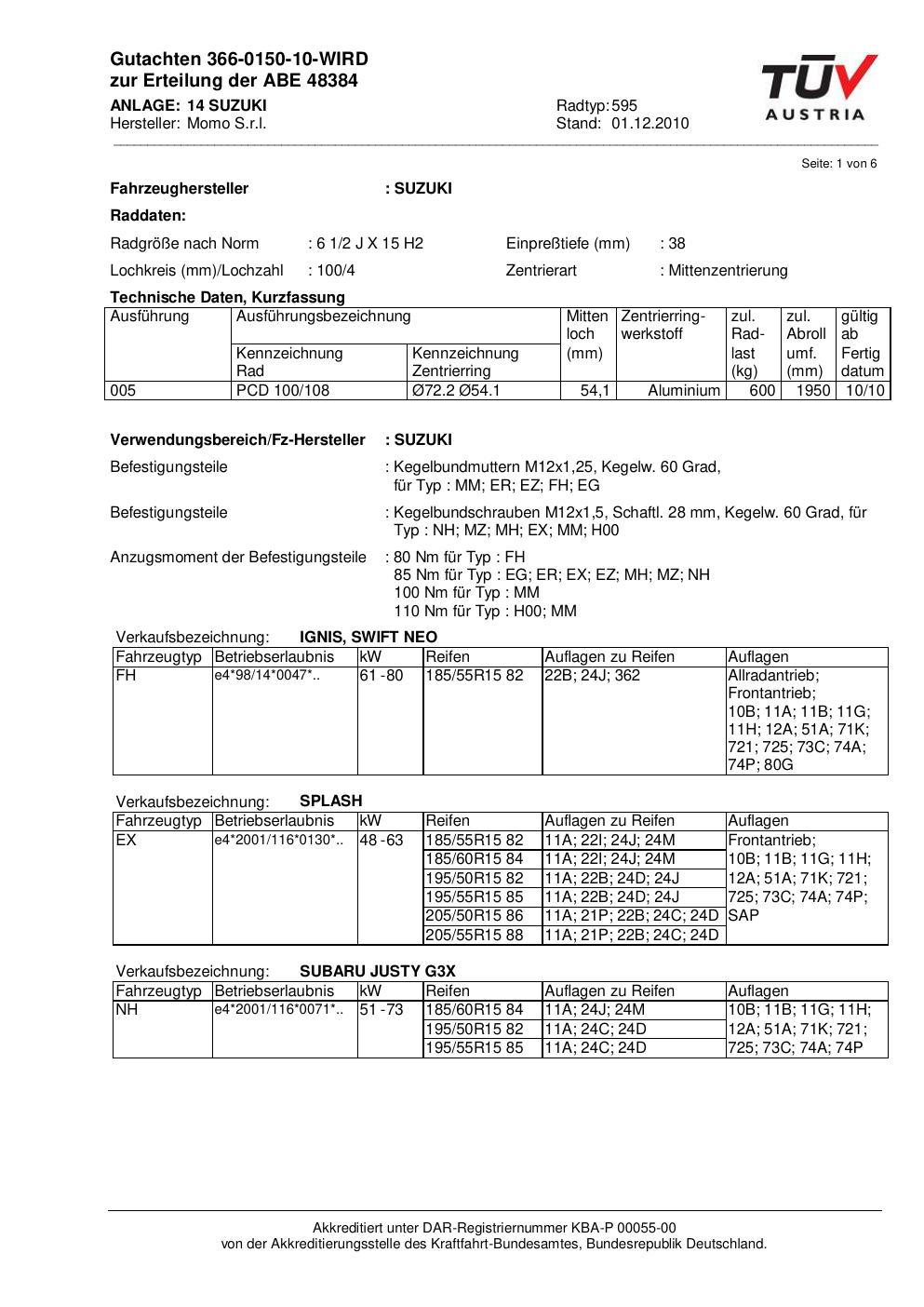 Dieses Gutachten (abe) bezieht sich auf die Alufelge brand-momo 595 in der Ausführung 2Jx15 ET 0, Mittenloch 0 mm (KBA 48384). Im PDF findest du typischerweise zulässige Reifengrößen, Auflagen/Anbauhinweise und – je nach Dokument – Hinweise zur Eintragung.