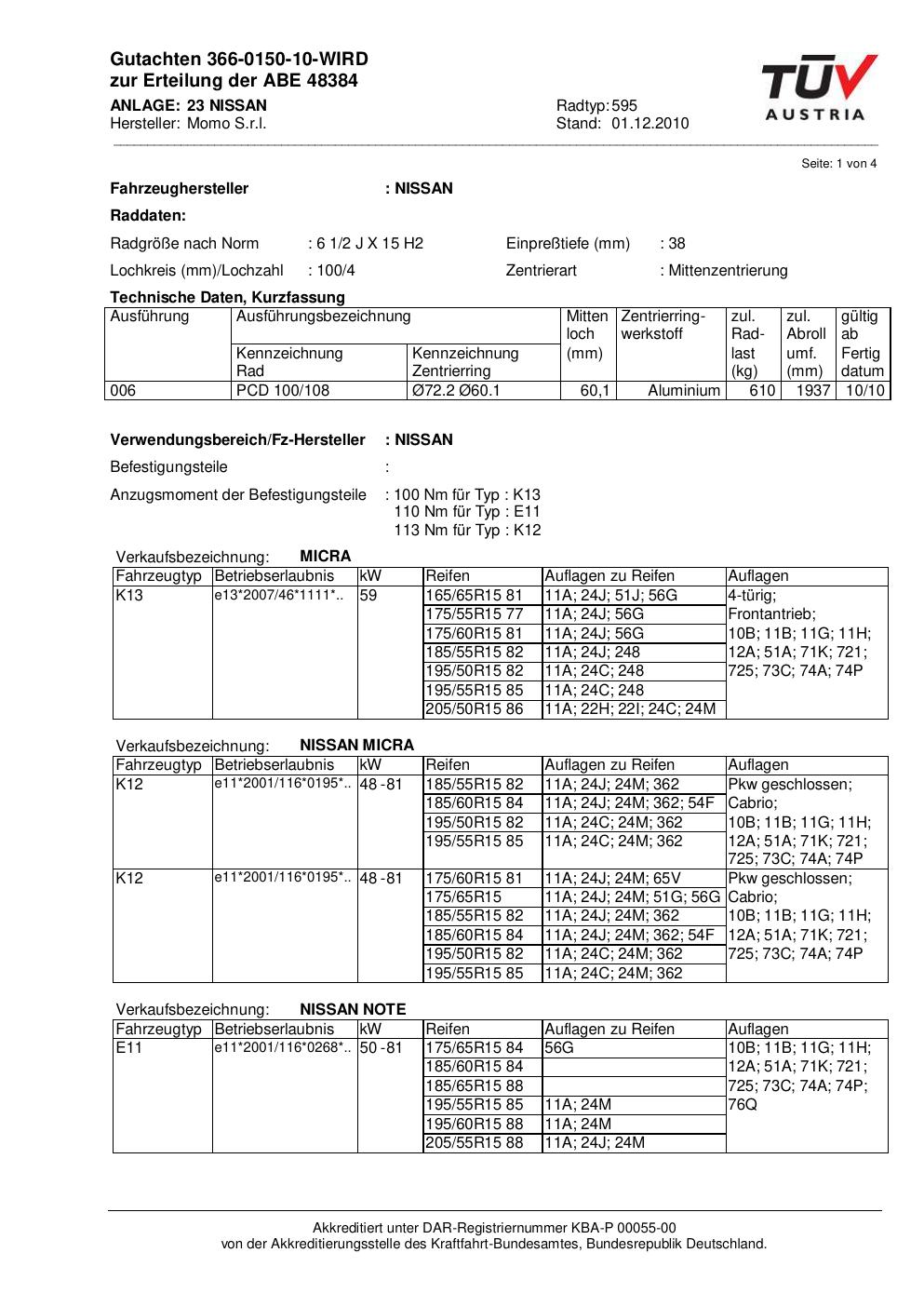Dieses Gutachten (abe) bezieht sich auf die Alufelge brand-momo 595 in der Ausführung 2Jx15 ET 0, Mittenloch 0 mm (KBA 48384). Im PDF findest du typischerweise zulässige Reifengrößen, Auflagen/Anbauhinweise und – je nach Dokument – Hinweise zur Eintragung.