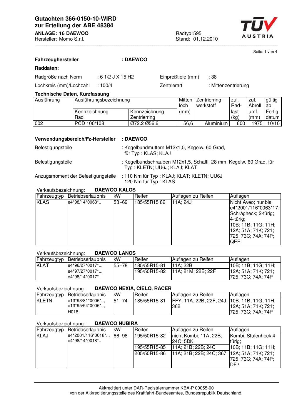 Felgengutachten / abe für Alufelgen brand-momo 595 (2Jx15 ET 0, Mittenloch 0 mm) mit KBA 48384 (Zertifikatsnummer 48384). Hier kostenlos als PDF herunterladen. Der Download-Link ist 24 Stunden gültig und kann bis zu zwei Mal verwendet werden.
