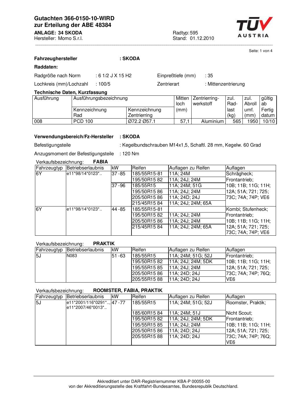 Dieses Gutachten (abe) bezieht sich auf die Alufelge brand-momo 595 in der Ausführung 2Jx15 ET 0, Mittenloch 0 mm (KBA 48384). Im PDF findest du typischerweise zulässige Reifengrößen, Auflagen/Anbauhinweise und – je nach Dokument – Hinweise zur Eintragung.