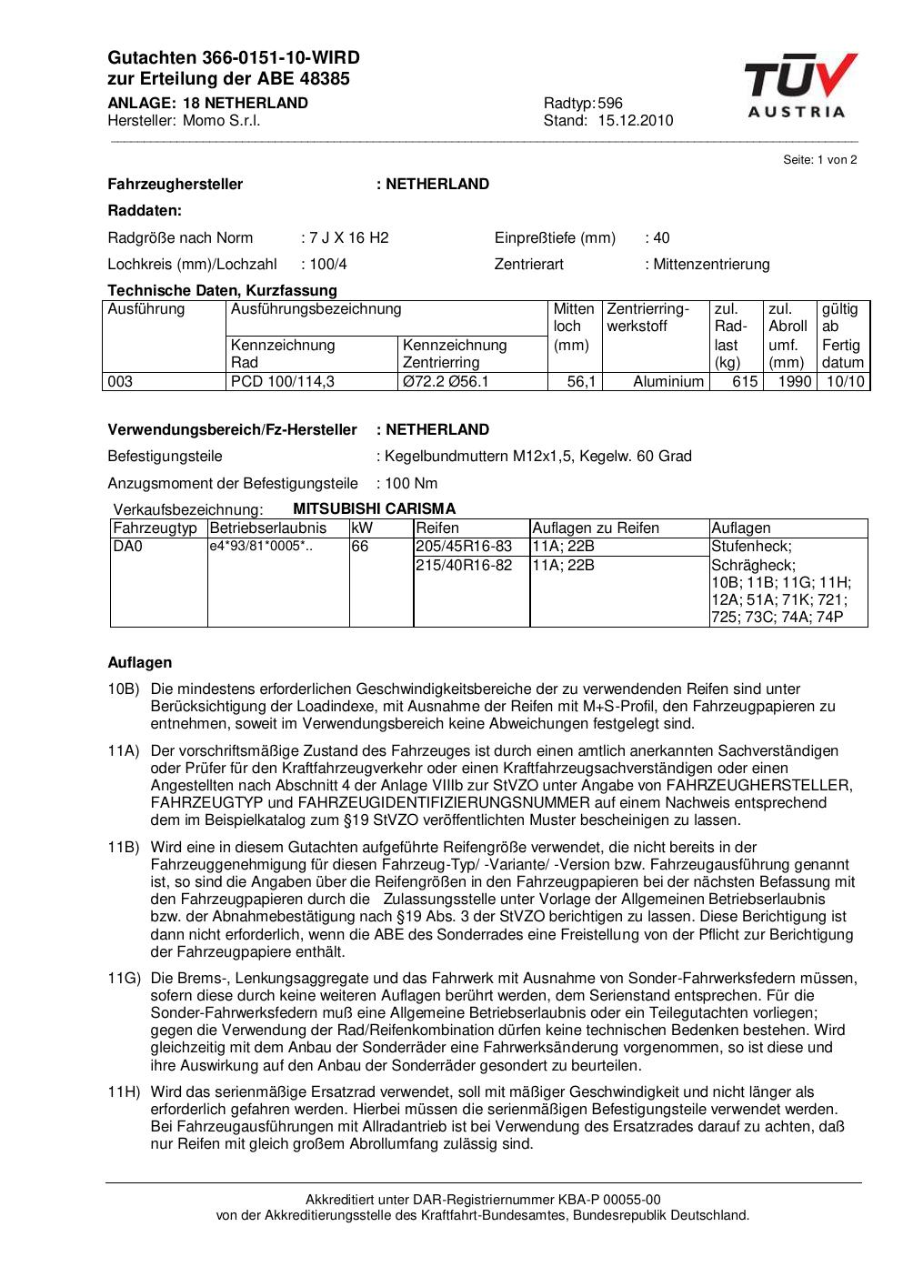 Dieses Gutachten (abe) bezieht sich auf die Alufelge Momo 596 in der Ausführung 7Jx16 ET 0, Mittenloch 0 mm (KBA 48385). Im PDF findest du typischerweise zulässige Reifengrößen, Auflagen/Anbauhinweise und – je nach Dokument – Hinweise zur Eintragung.