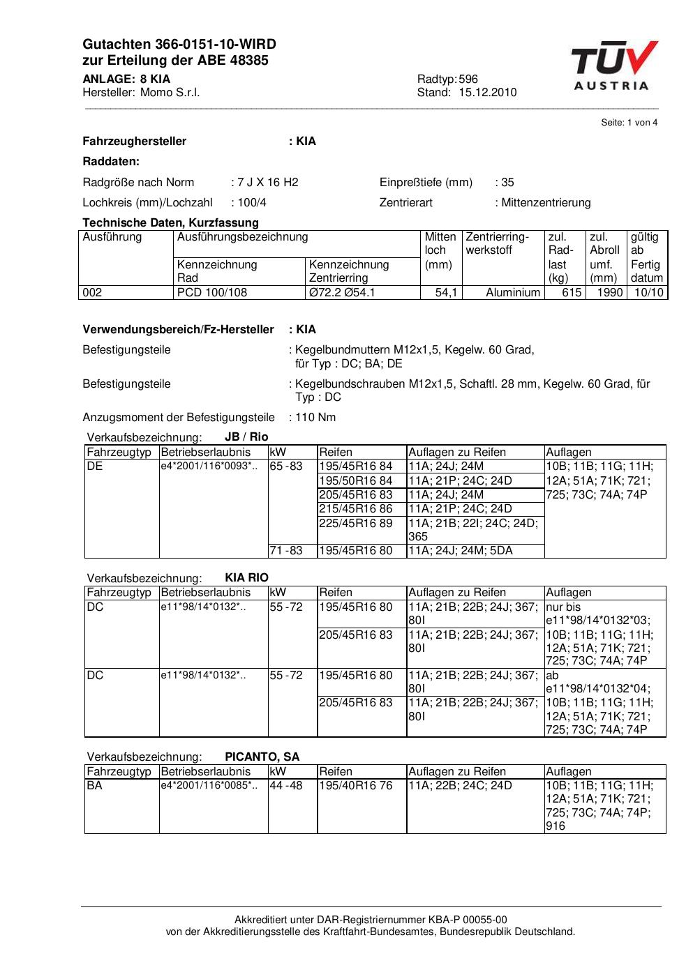 Dieses Gutachten (abe) bezieht sich auf die Alufelge Momo 596 in der Ausführung 7Jx16 ET 0, Mittenloch 0 mm (KBA 48385). Im PDF findest du typischerweise zulässige Reifengrößen, Auflagen/Anbauhinweise und – je nach Dokument – Hinweise zur Eintragung.