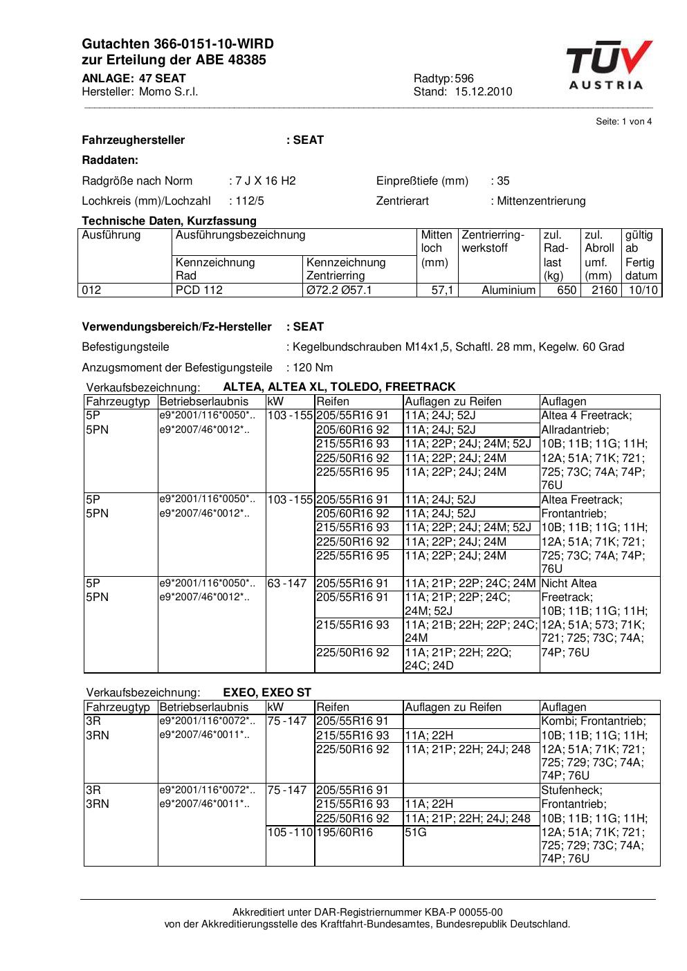 Dieses Gutachten (abe) bezieht sich auf die Alufelge Momo 596 in der Ausführung 7Jx16 ET 0, Mittenloch 0 mm (KBA 48385). Im PDF findest du typischerweise zulässige Reifengrößen, Auflagen/Anbauhinweise und – je nach Dokument – Hinweise zur Eintragung.
