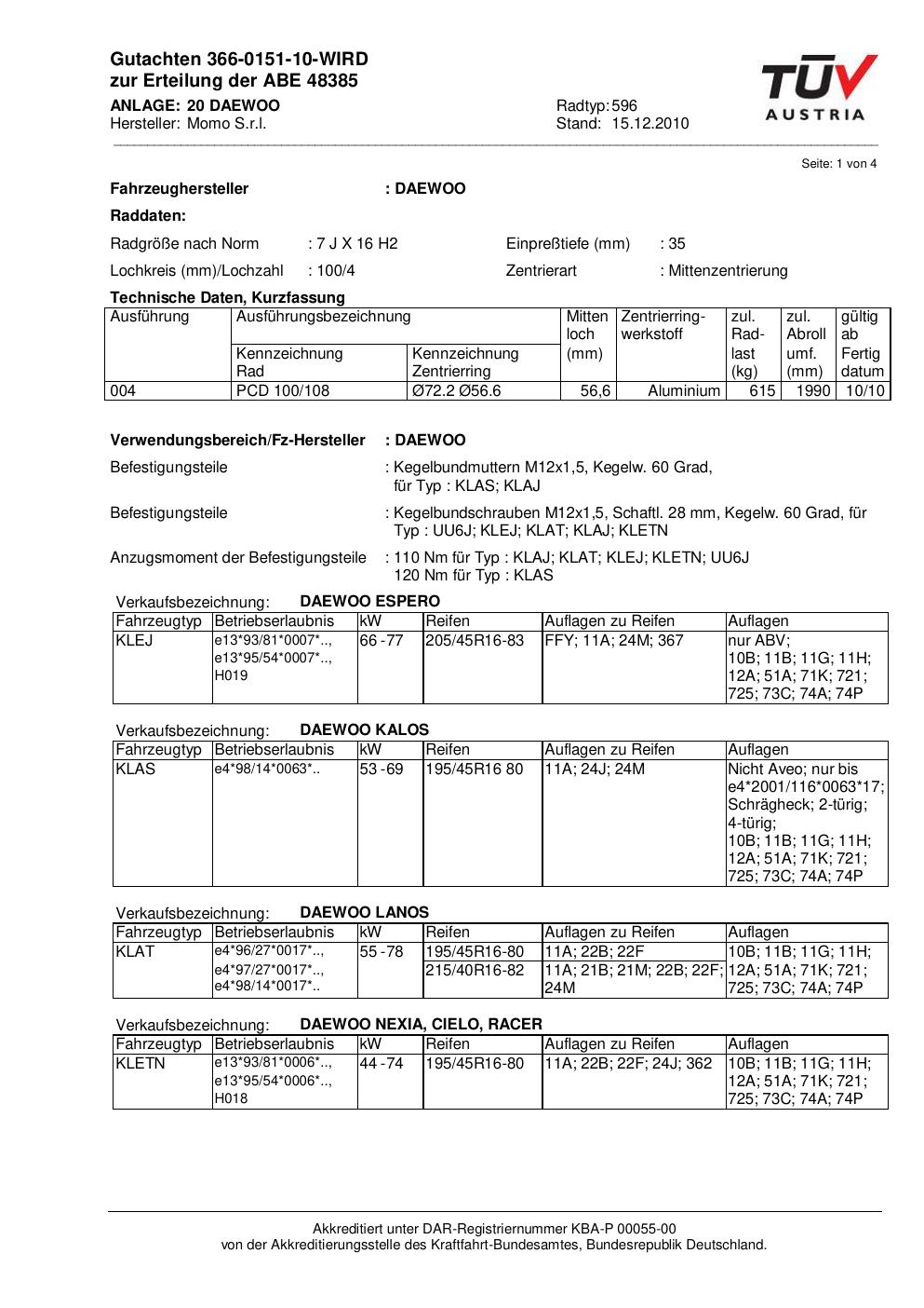 Dieses Gutachten (abe) bezieht sich auf die Alufelge Momo 596 in der Ausführung 7Jx16 ET 0, Mittenloch 0 mm (KBA 48385). Im PDF findest du typischerweise zulässige Reifengrößen, Auflagen/Anbauhinweise und – je nach Dokument – Hinweise zur Eintragung.