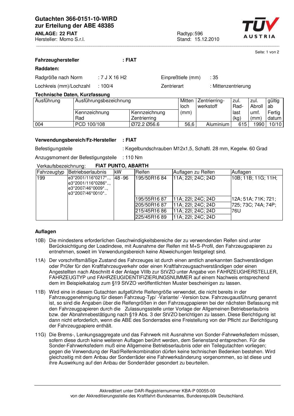 Dieses Gutachten (abe) bezieht sich auf die Alufelge Momo 596 in der Ausführung 7Jx16 ET 0, Mittenloch 0 mm (KBA 48385). Im PDF findest du typischerweise zulässige Reifengrößen, Auflagen/Anbauhinweise und – je nach Dokument – Hinweise zur Eintragung.