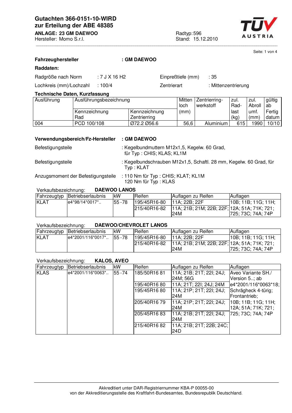 Dieses Gutachten (abe) bezieht sich auf die Alufelge Momo 596 in der Ausführung 7Jx16 ET 0, Mittenloch 0 mm (KBA 48385). Im PDF findest du typischerweise zulässige Reifengrößen, Auflagen/Anbauhinweise und – je nach Dokument – Hinweise zur Eintragung.