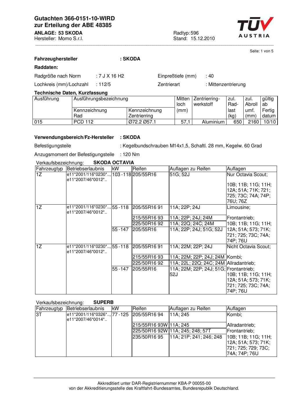 Dieses Gutachten (abe) bezieht sich auf die Alufelge Momo 596 in der Ausführung 7Jx16 ET 0, Mittenloch 0 mm (KBA 48385). Im PDF findest du typischerweise zulässige Reifengrößen, Auflagen/Anbauhinweise und – je nach Dokument – Hinweise zur Eintragung.