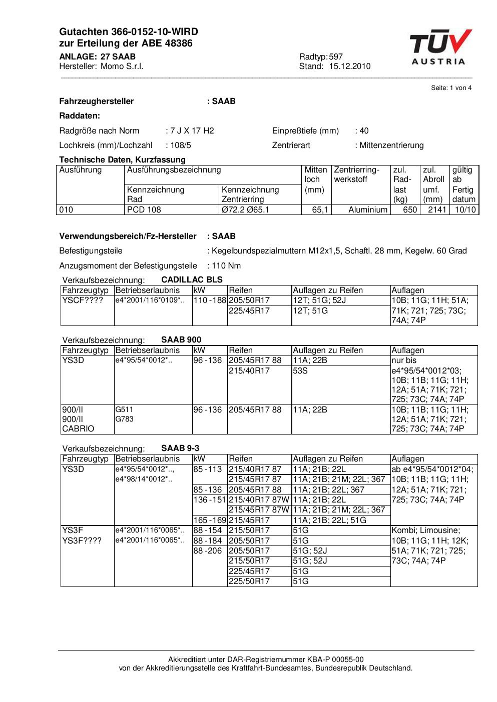 Dieses Gutachten (abe) bezieht sich auf die Alufelge Momo 597 in der Ausführung 7Jx17 ET 0, Mittenloch 0 mm (KBA 48386). Im PDF findest du typischerweise zulässige Reifengrößen, Auflagen/Anbauhinweise und – je nach Dokument – Hinweise zur Eintragung.