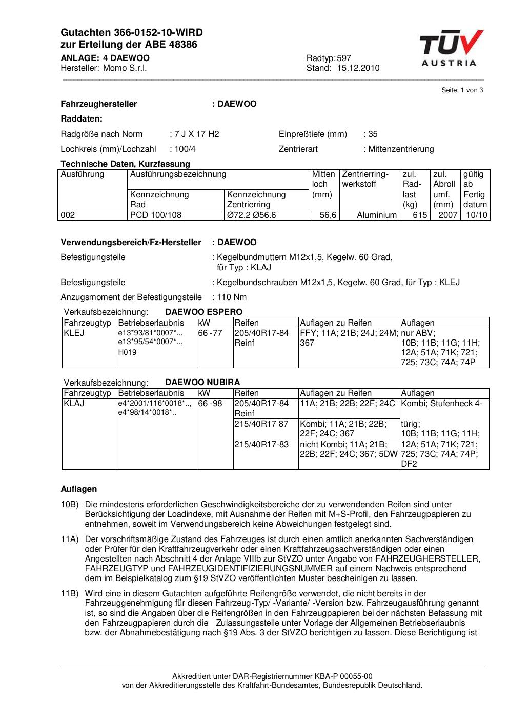 Dieses Gutachten (abe) bezieht sich auf die Alufelge Momo 597 in der Ausführung 7Jx17 ET 0, Mittenloch 0 mm (KBA 48386). Im PDF findest du typischerweise zulässige Reifengrößen, Auflagen/Anbauhinweise und – je nach Dokument – Hinweise zur Eintragung.