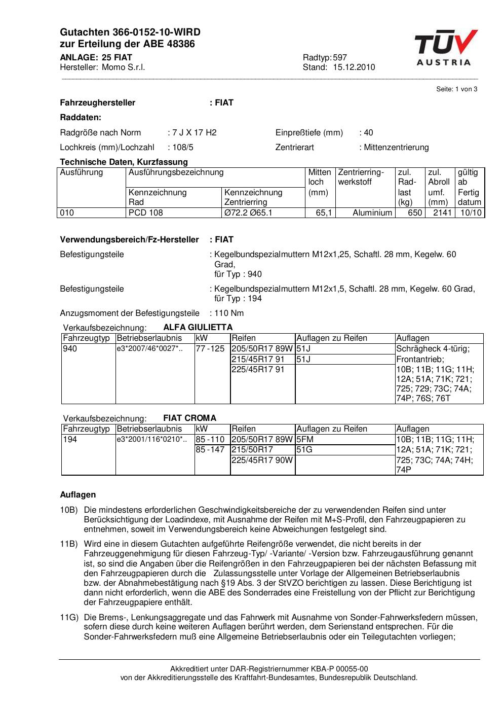 Felgengutachten / abe für Alufelgen Momo 597 (7Jx17 ET 0, Mittenloch 0 mm) mit KBA 48386 (Zertifikatsnummer 48386). Hier kostenlos als PDF herunterladen. Der Download-Link ist 24 Stunden gültig und kann bis zu zwei Mal verwendet werden.