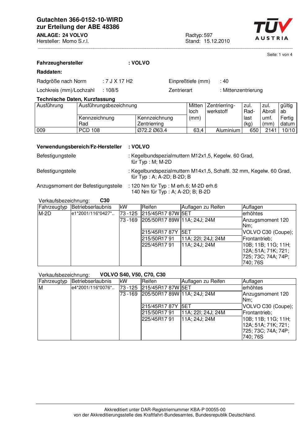 Dieses Gutachten (abe) bezieht sich auf die Alufelge Momo 597 in der Ausführung 7Jx17 ET 0, Mittenloch 0 mm (KBA 48386). Im PDF findest du typischerweise zulässige Reifengrößen, Auflagen/Anbauhinweise und – je nach Dokument – Hinweise zur Eintragung.