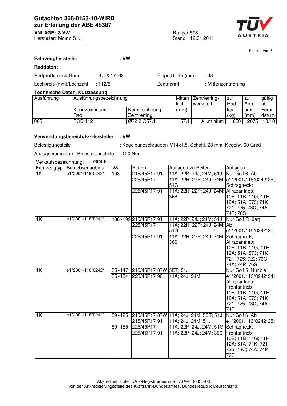 Dieses Gutachten (abe) bezieht sich auf die Alufelge brand-momo 598 in der Ausführung 8Jx17 ET 0, Mittenloch 0 mm (KBA 48387). Im PDF findest du typischerweise zulässige Reifengrößen, Auflagen/Anbauhinweise und – je nach Dokument – Hinweise zur Eintragung.