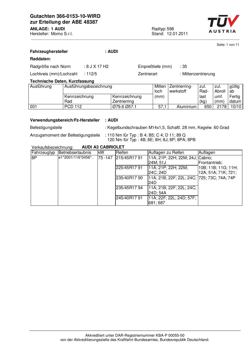 Dieses Gutachten (abe) bezieht sich auf die Alufelge brand-momo 598 in der Ausführung 8Jx17 ET 0, Mittenloch 0 mm (KBA 48387). Im PDF findest du typischerweise zulässige Reifengrößen, Auflagen/Anbauhinweise und – je nach Dokument – Hinweise zur Eintragung.
