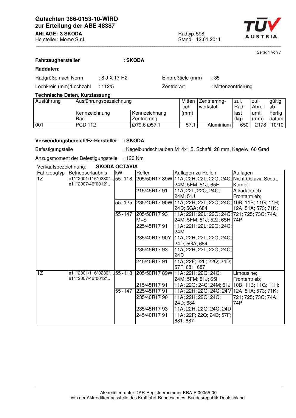 Dieses Gutachten (abe) bezieht sich auf die Alufelge Momo 598 in der Ausführung 8Jx17 ET 0, Mittenloch 0 mm (KBA 48387). Im PDF findest du typischerweise zulässige Reifengrößen, Auflagen/Anbauhinweise und – je nach Dokument – Hinweise zur Eintragung.