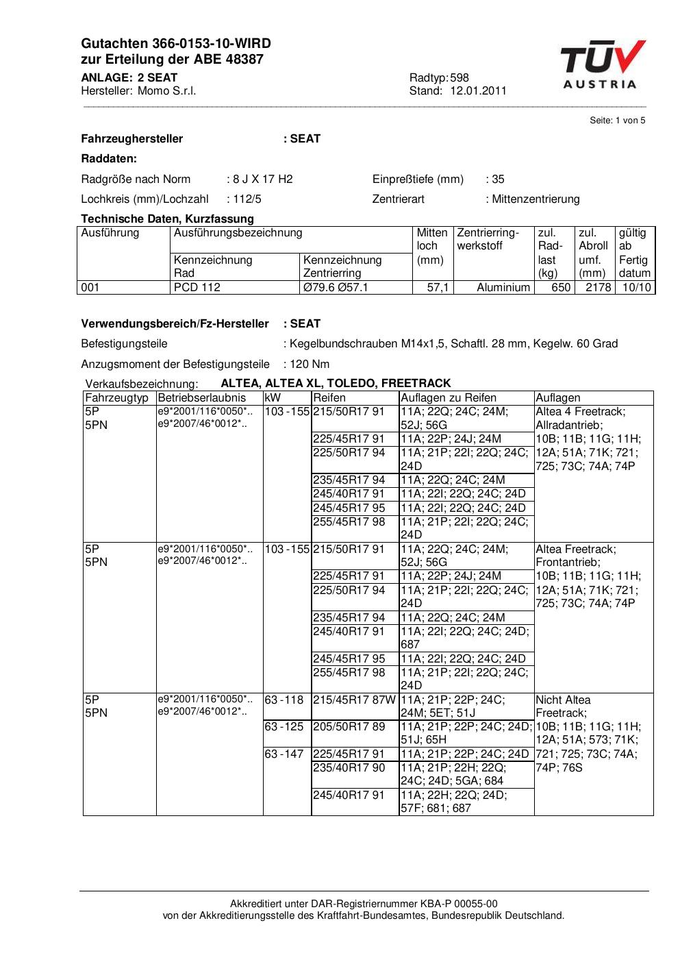 Dieses Gutachten (abe) bezieht sich auf die Alufelge Momo 598 in der Ausführung 8Jx17 ET 0, Mittenloch 0 mm (KBA 48387). Im PDF findest du typischerweise zulässige Reifengrößen, Auflagen/Anbauhinweise und – je nach Dokument – Hinweise zur Eintragung.