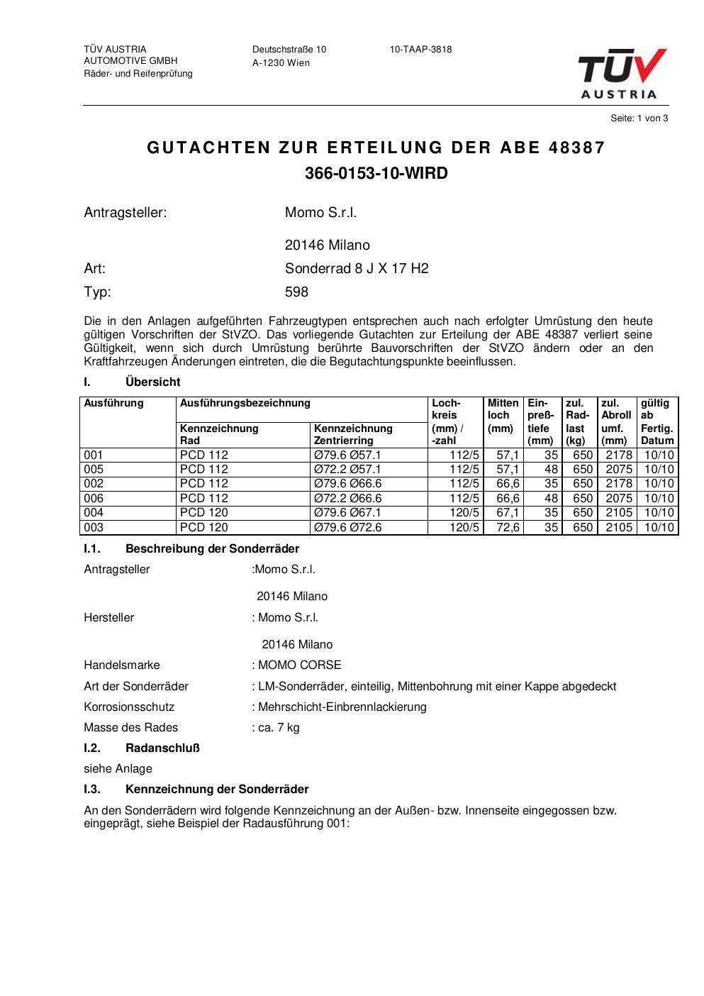 Dieses Gutachten (abe) bezieht sich auf die Alufelge brand-momo 598 in der Ausführung 8Jx17 ET 0, Mittenloch 0 mm (KBA 48387). Im PDF findest du typischerweise zulässige Reifengrößen, Auflagen/Anbauhinweise und – je nach Dokument – Hinweise zur Eintragung.