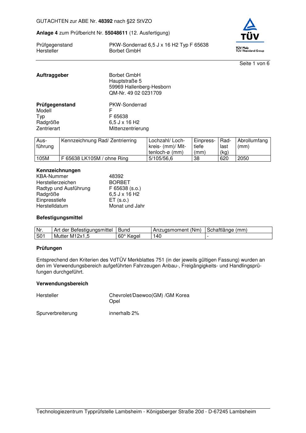 Dieses Gutachten (abe) bezieht sich auf die Alufelge Borbet F 65 638 in der Ausführung 6.5Jx16 ET 0, Mittenloch 0 mm (KBA 48392). Im PDF findest du typischerweise zulässige Reifengrößen, Auflagen/Anbauhinweise und – je nach Dokument – Hinweise zur Eintragung.
