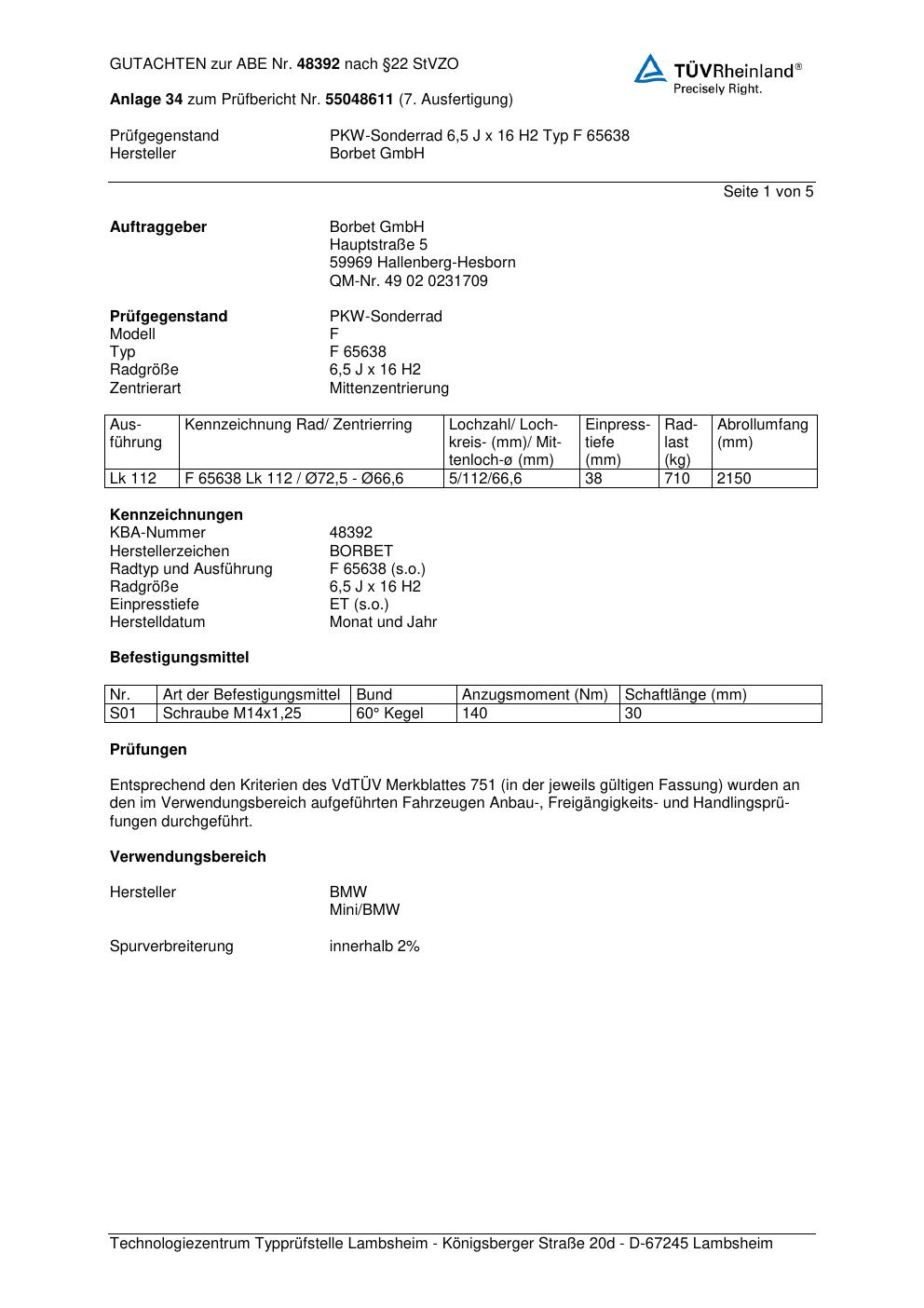 Dieses Gutachten (abe) bezieht sich auf die Alufelge Borbet F 65 638 in der Ausführung 6.5Jx16 ET 0, Mittenloch 0 mm (KBA 48392). Im PDF findest du typischerweise zulässige Reifengrößen, Auflagen/Anbauhinweise und – je nach Dokument – Hinweise zur Eintragung.